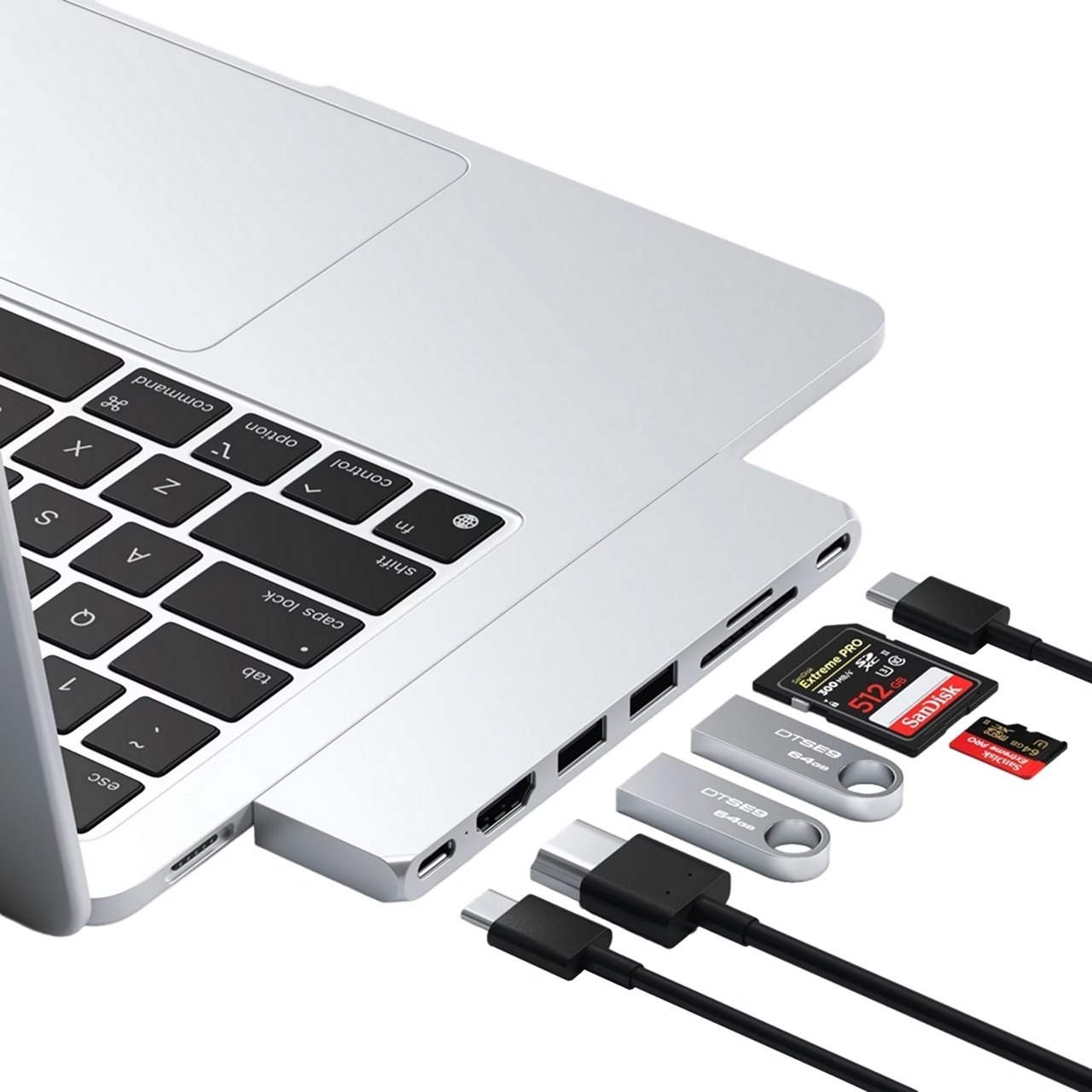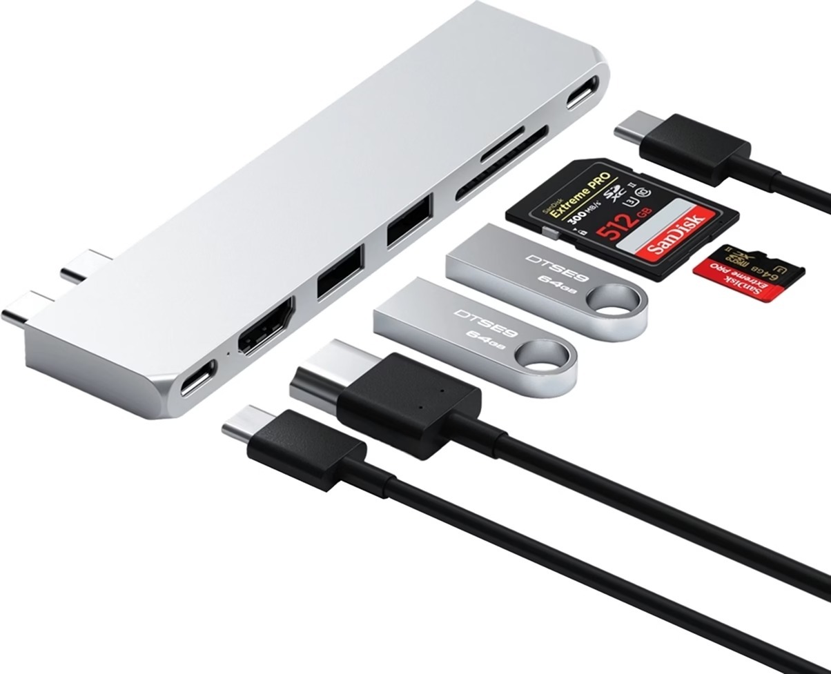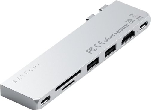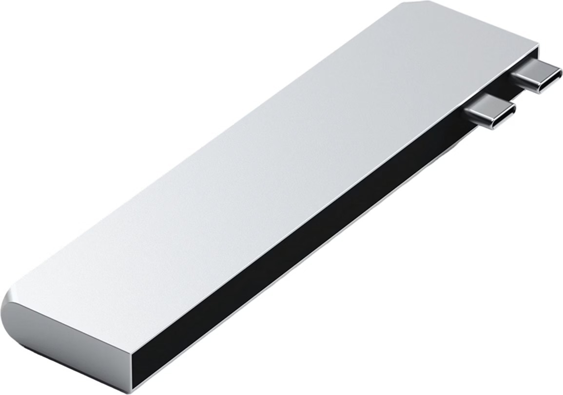 USB-хаб Satechi Pro Hub Slim — це компактний і елегантний адаптер USB-C, створений спеціально для власників MacBook, щоб перетворити один порт на повноцінну робочу станцію. Завдяки подвійному USB-C з'єднанню він надійно фіксується на ноутбуці, усуваючи хитання, і дозволяє одночасно заряджати пристрій, виводити зображення на зовнішній монітор та передавати дані з високою швидкістю. Його ультратонкий і легкий дизайн ідеально підходить для подорожей та щоденного використання.