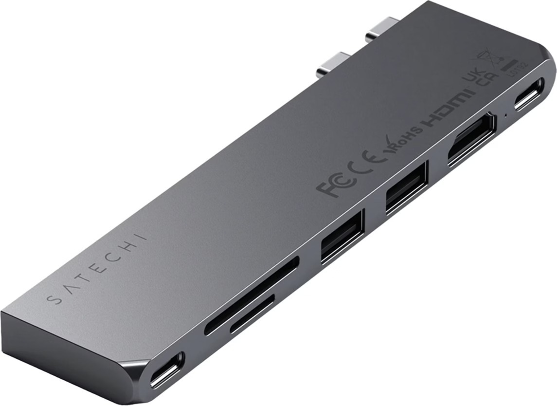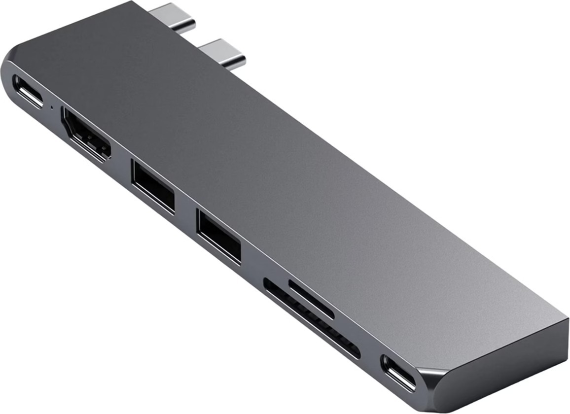 USB-хаб Satechi Pro Hub Slim — це компактний і елегантний адаптер USB-C, створений спеціально для власників MacBook, щоб перетворити один порт на повноцінну робочу станцію. Завдяки подвійному USB-C з'єднанню він надійно фіксується на ноутбуці, усуваючи хитання, і дозволяє одночасно заряджати пристрій, виводити зображення на зовнішній монітор та передавати дані з високою швидкістю. Його ультратонкий і легкий дизайн ідеально підходить для подорожей та щоденного використання.