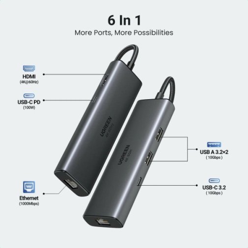 UGREEN CM512 — це стильний і функціональний 6-в-1 USB-C хаб, який ідеально підходить для сучасних ультрабуків і планшетів з обмеженою кількістю портів. Компактний алюмінієвий корпус надійно відводить тепло і легко поміщається навіть у невеликій сумці, дозволяючи завжди мати під рукою всі необхідні роз’єми.