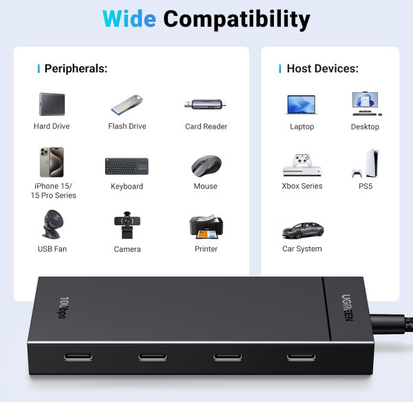 Хаб USB 3.2 Type-C Ugreen CM806 додасть вашому пристрою чотири порти USB Type-C, які забезпечують обмін даними зі швидкістю до 10 Гбіт/с. Ви зможете одночасно підключити до ноутбука клавіатуру, мишу, флеш-накопичувач, принтер та інші пристрої.