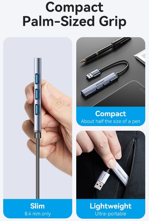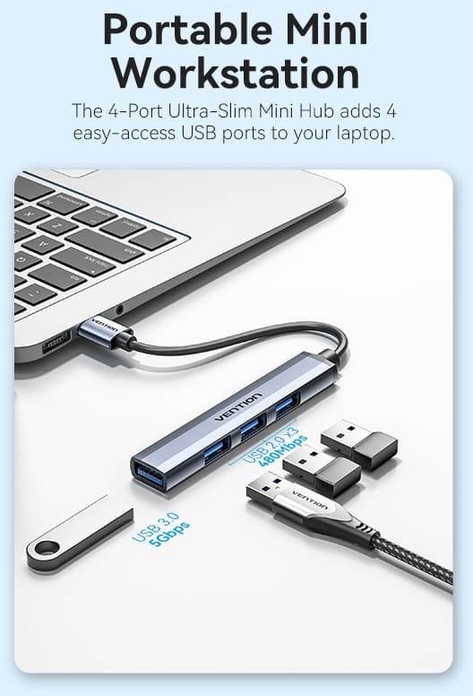 USB-хаб Vention 4 Port USB 3.0 — це компактний, стильний і дуже практичний розгалужувач, який перетворює один USB-порт твого ноутбука, моноблока, телевізора чи док-станції на повноцінний робочий хаб з чотирма швидкими портами без зайвих дротів і перешкод.