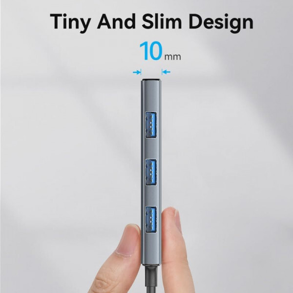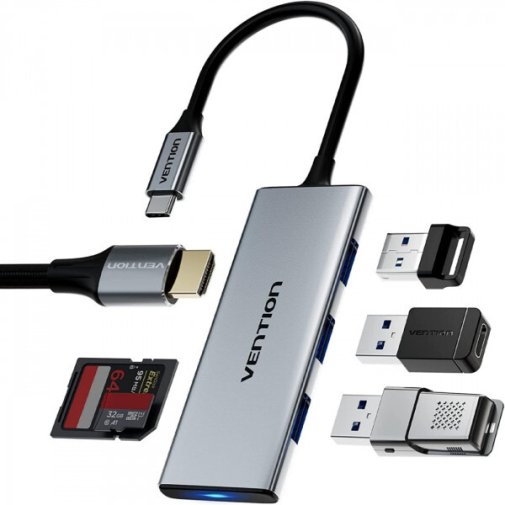 Vention TOOHB 6in1 — компактна докстанція, яка підключається через один USB-C порт і водночас розширює можливості ноутбука або смартфона до шести різних з'єднань. Ультратонкий корпус завтовшки лише 10 мм виготовлений з алюмінієвого сплаву, що надає пристрою міцності й водночас зберігає охайний і стриманий вигляд. Завдяки невеликим розмірам хаб однаково зручний як для постійного робочого місця, так і для роботи в дорозі.