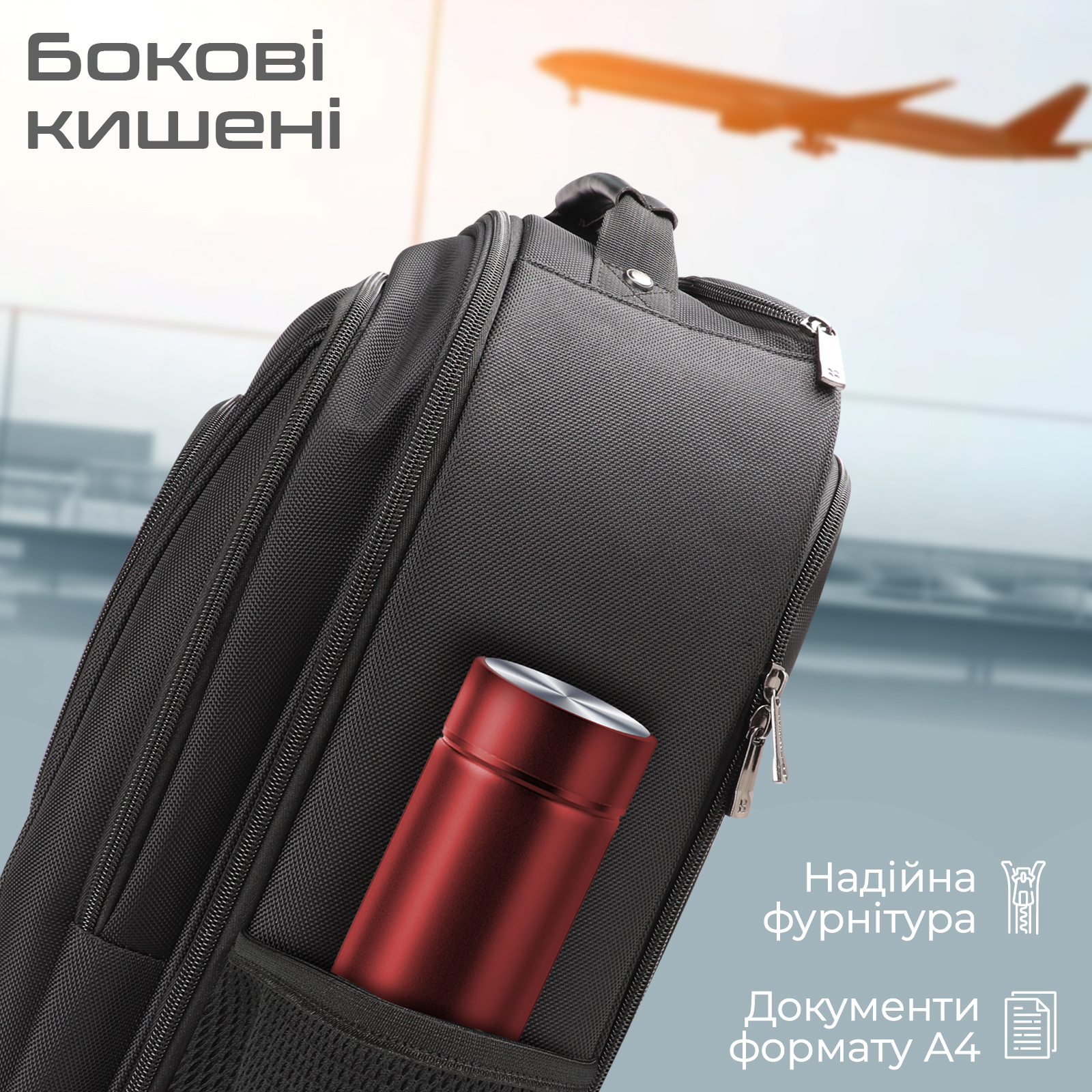 4 відсіки на змійці, кишені для ноутбука та планшета, кишені для речей, відділення та фіксатор для одягу, вбудований органайзер для гаджетів та візиток, 2 зовнішні кишені для їжі та напоїв, а також відділення на змійці для телескопічної ручки.