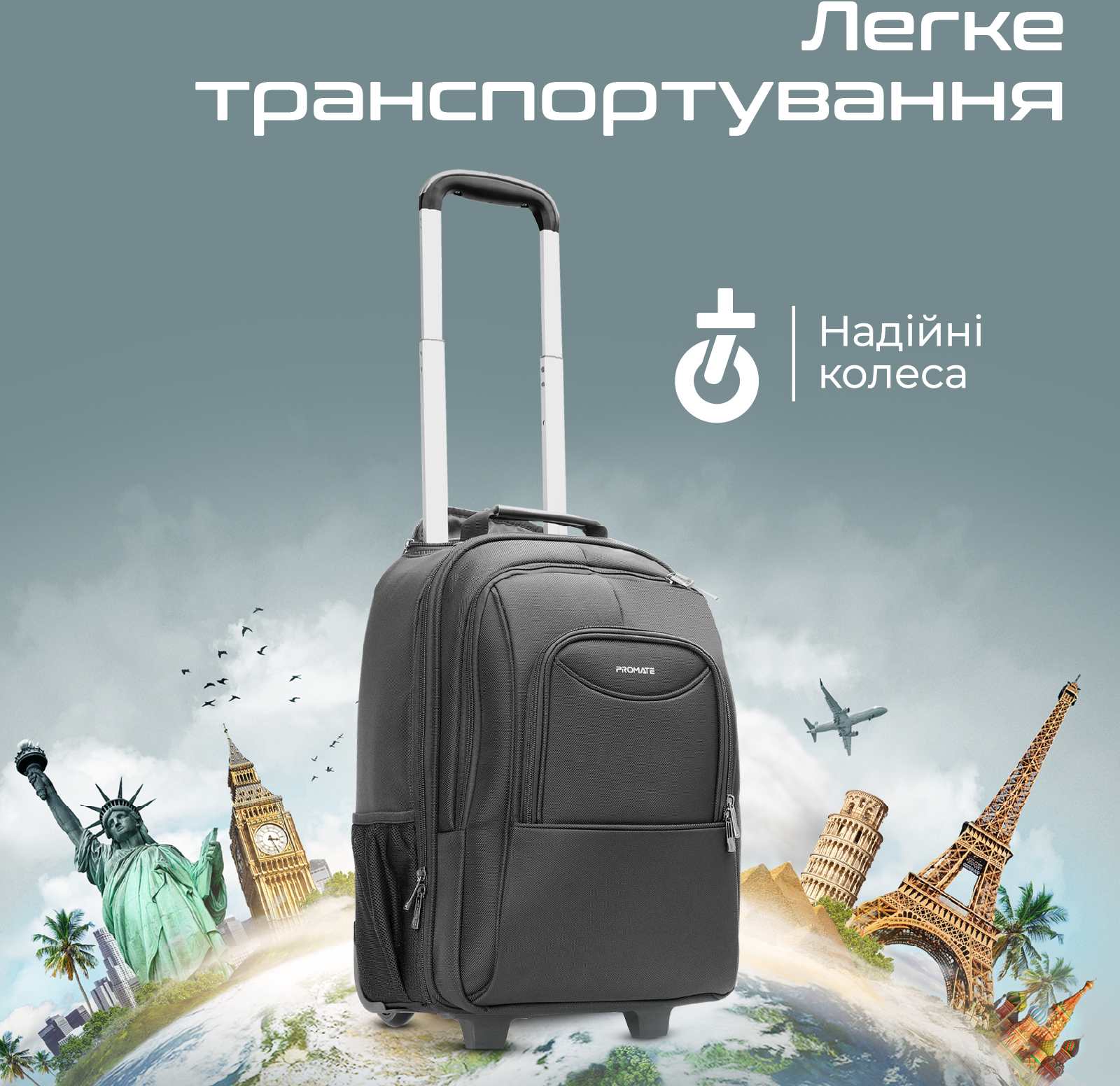 Mogul-TR — надійний та максимально місткий рюкзак-валіза від Promate. Зручне транспортування, велика кількість відділень та водовідштовхувальний матеріал дозволяють подорожувати з комфортом, не боячись змін погоди.