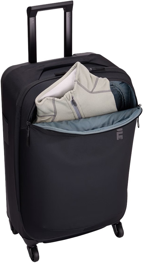 Функціональність валізи Thule Subterra Checked Spinner робить її незамінною для організованих подорожей. Знімне відділення дозволяє стискати одяг і фіксувати речі, максимізуючи простір, а також може використовуватися окремо в інших моделях багажу. У передній панелі є складаний розділювач, який зручно відокремлює взуття від одягу, запобігаючи забрудненню. Швидка доступна зовнішня кишеня відкривається як зсередини, так і зовні, що полегшує отримання необхідних дрібниць без повного розпакування. Компресійні ремені працюють у парі зі знімним відділенням або самостійно, забезпечуючи гнучкість у пакуванні, а тихі колеса гарантують плавний рух без зайвого шуму.