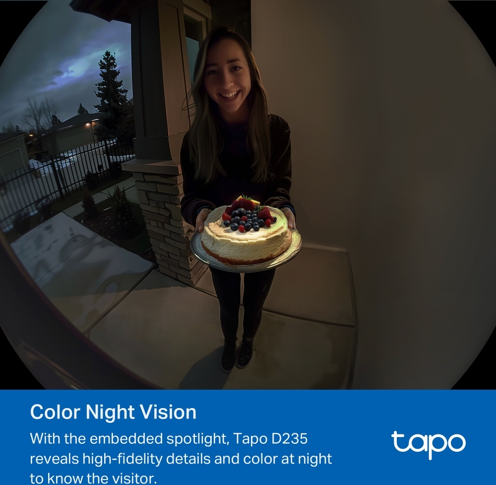 Відеодзвінок TP-Link Tapo D235 — це сучасне рішення для безпеки вашого дому, яке поєднує передові технології та зручність використання. Завдяки роздільній здатності 2K 5MP і надширокому куту огляду 180° пристрій захоплює кожну деталь, забезпечуючи чітке зображення від голови до ніг. Це дозволяє бачити все, що відбувається біля ваших дверей, навіть у складних умовах освітлення, завдяки повноколірному нічному баченню з прожектором.