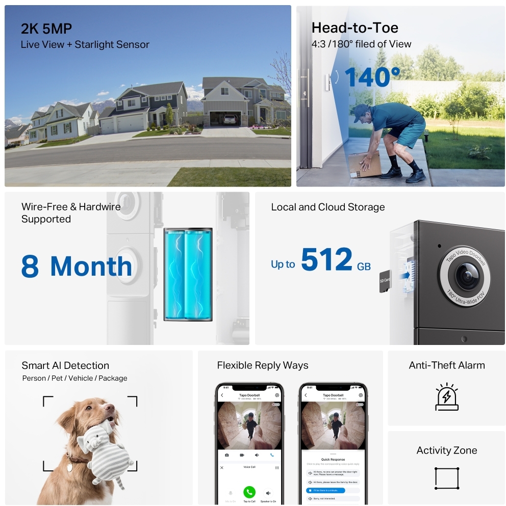 Для зручного зберігання відеозаписів пристрій підтримує microSD-карти або хмарне сховище Tapo Care. Двосторонній аудіозв’язок дозволяє спілкуватися з відвідувачами або використовувати швидкі налаштовані відповіді, що економить час. Вбудований дзвінок із різноманітними мелодіями та функція протиугінної сигналізації додають зручності та безпеки. Tapo D235 легко інтегрується з ШІ-асистентами, дозволяючи переглядати трансляцію на сумісних пристроях.