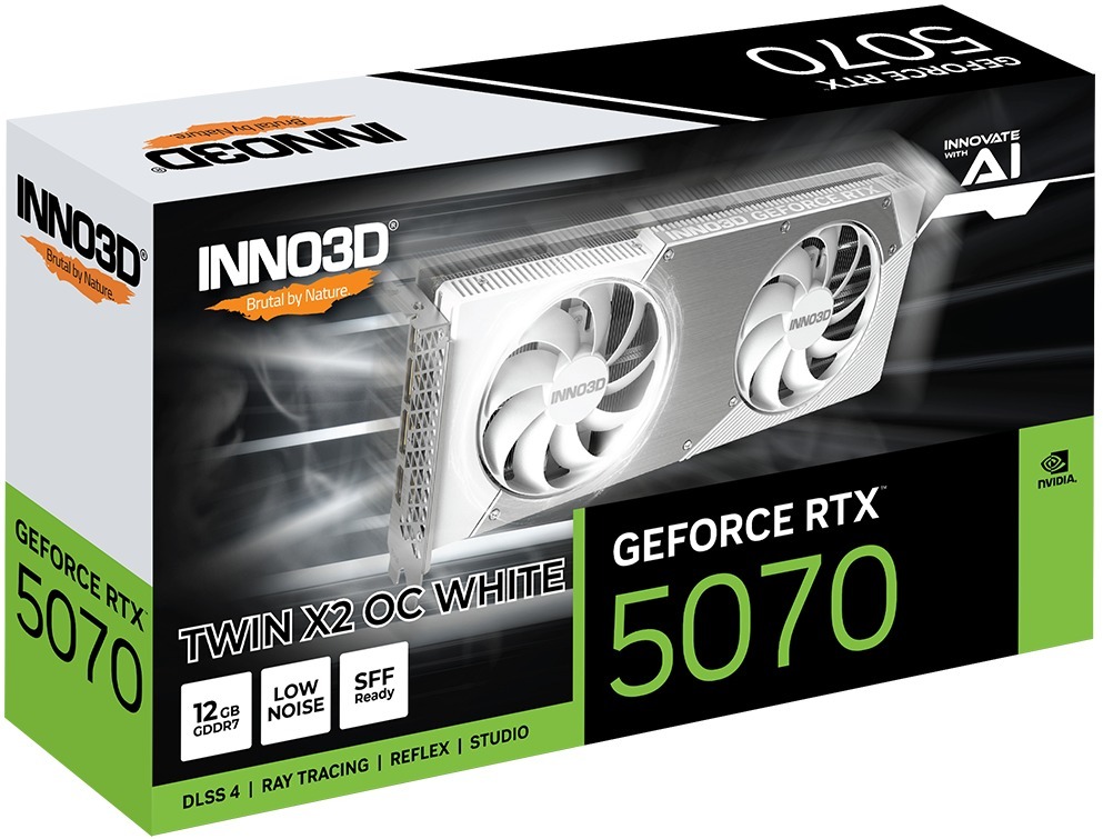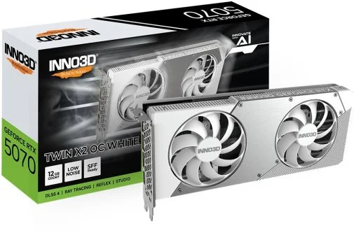 Inno3D GeForce RTX 5070 Twin X2 OC White — компактна та потужна відеокарта нового покоління у стриманому білому дизайні, створена для ентузіастів, які цінують як продуктивність, так і естетику. Двослотовий корпус дозволяє встановити її в системи формату Small Form Factor без втрати обчислювальної потужності.