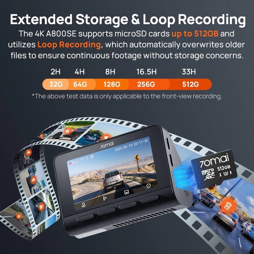 70mai Dash Cam 4K A800SE поєднує високу якість зображення, інтелектуальні функції безпеки та сучасні можливості підключення, перетворюючи кожну поїздку на контрольований і надійно зафіксований маршрут.