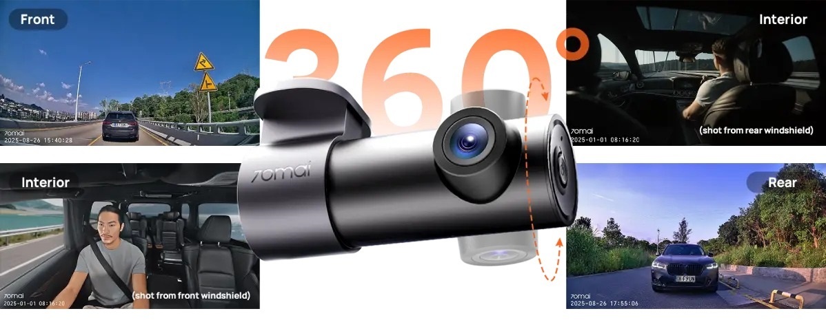 Об'єктив реєстратора обертається на 360°, що дозволяє вибрати будь-який зручний кут зйомки. За потреби пристрій можна встановити на задньому склі автомобіля для фіксації того, що відбувається позаду, — залежно від моделі авто може знадобитися подовжувальний кабель.