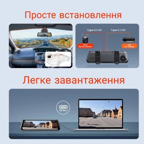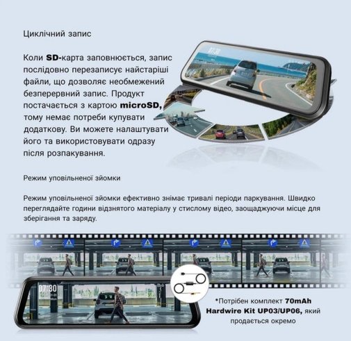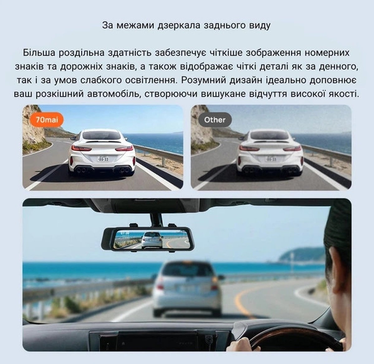 Кріплення встановлюється поверх штатного дзеркала за допомогою регульованих ременів, корпус має розсувну конструкцію для підгонки під різні розміри дзеркал, а кут об'єктива регулюється вручну. Пристрій підтримує карти microSD від 32 до 256 ГБ, управляється через Wi-Fi та застосунок 70mai, а за потреби підключається опціональний GPS-модуль для запису маршруту, швидкості та часових міток.