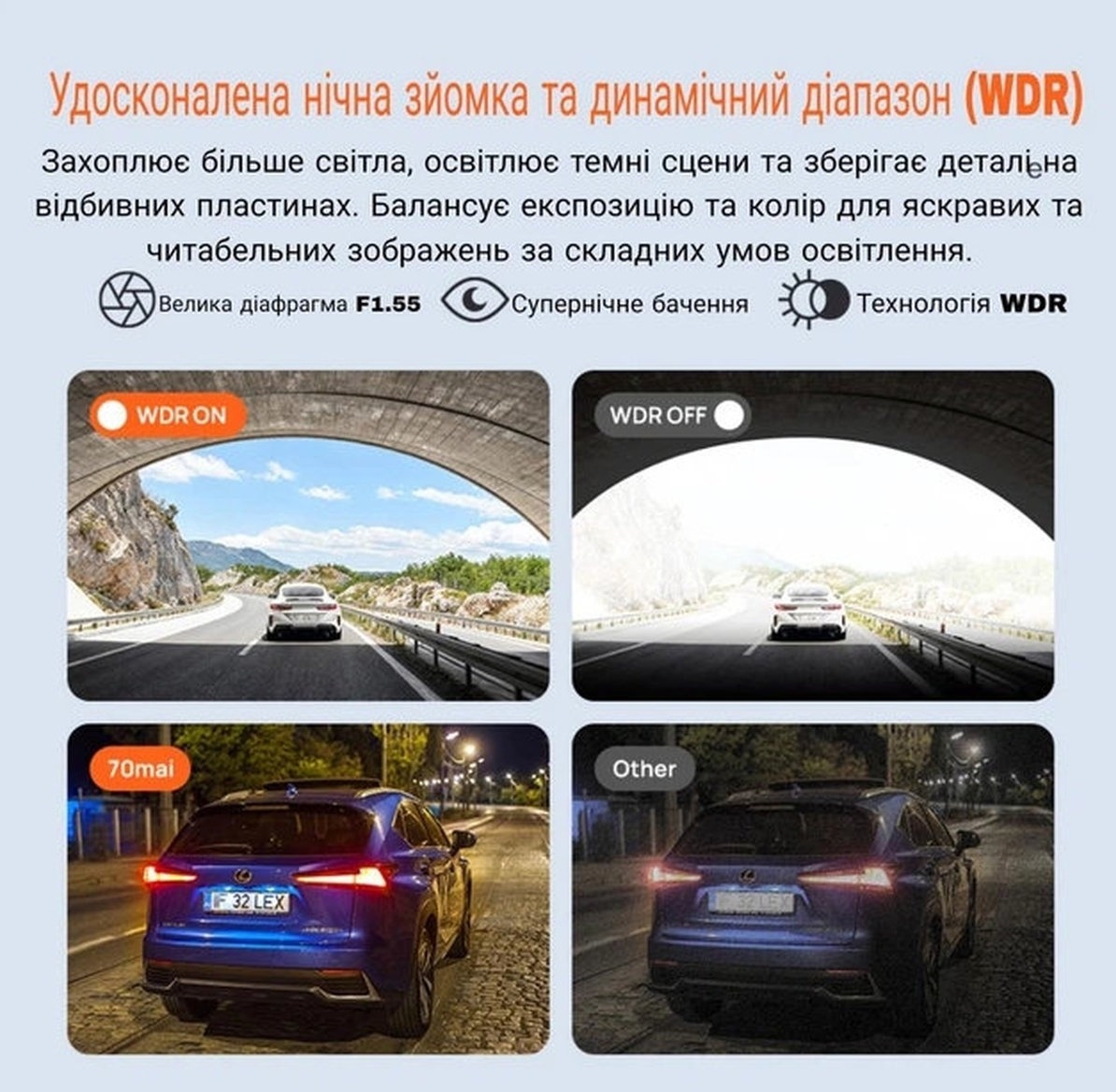 Передня камера пишає роздільною здатністю 2.5K (2560×1440P) при 30 FPS, що дозволяє чітко фіксувати номерні знаки, дорожні знаки та деталі навколишнього середовища у будь-яких умовах руху. Задня камера RC15 пише у форматі 1080P при 25 FPS та захищена за стандартом IP67 — вона не боїться дощу, туману та нічних умов. Кут огляду передньої камери — 125°, задньої — 120°, що мінімізує сліпі зони. Діафрагма передньої лінзи F1.55 у поєднанні з технологією WDR та фірмовим алгоритмом Super Night Vision забезпечує яскраве та деталізоване зображення навіть у темних тунелях і на нічних дорогах — це одна з найпопулярніших вимог до відеореєстраторів серед автовласників.