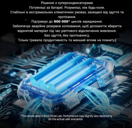 Функція буферизованого екстреного запису зберігає до 3 хвилин до та 30 секунд після будь-якого інциденту — вся ключова доказова база потрапляє до окремої папки «Emergency video» і доступна через застосунок 70mai. Режим паркування 24/7 автоматично активується при виявленні удару G-сенсором і фіксує 30-секундне відео навіть за відсутності водія. Також підтримується запис у режимі time-lapse. Замість акумулятора використовується суперконденсатор — він витримує до 500 000 циклів заряду, стабільно працює в діапазоні температур від -10°C до +60°C і не схильний до роздуття чи протікання.