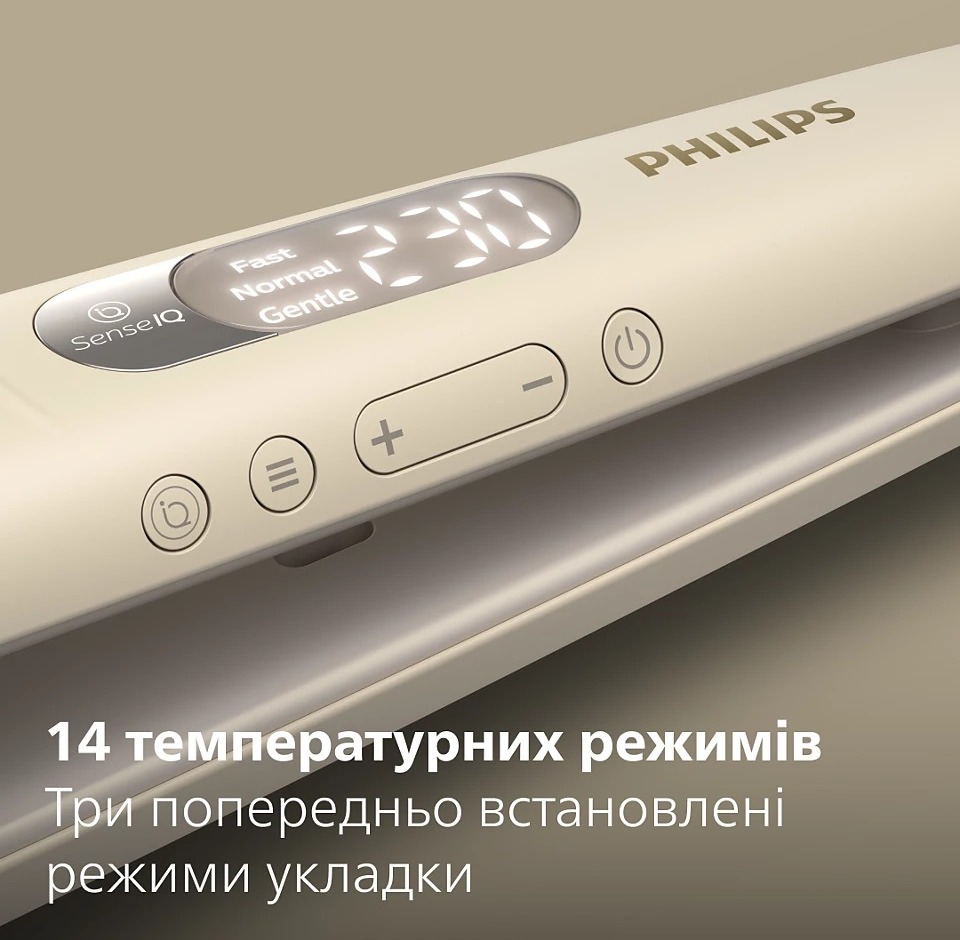 Для зручності укладання передбачено три режими роботи — швидкий, стандартний і лагідний, що дозволяють підібрати інтенсивність відповідно до типу волосся. У кожному з них технологія SenseIQ залишається активною, щоб підтримувати оптимальну температуру. Крім того, користувач може вручну обрати одну з 14 температур у діапазоні від 120°C до 230°C, що відкриває можливості для будь-якої зачіски — від легких хвиль до ідеально прямого полотна.