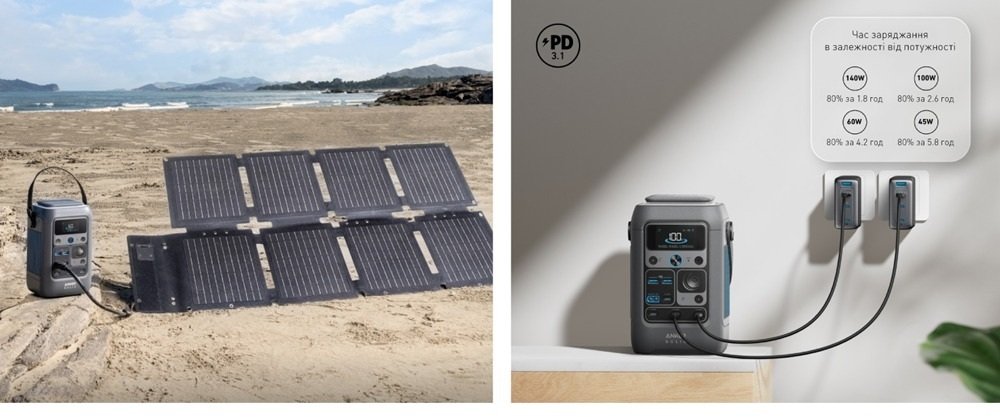 Зарядна станція Anker Solix C300XDC 140W 288Wh у комплекті з сонячною панеллю PS60 — це компактна, надійна та дуже практична портативна енергосистема, створена спеціально для тих, хто хоче залишатися незалежним від розетки під час кемпінгу, риболовлі, подорожей автомобілем, відключень електроенергії чи використання на дачі.