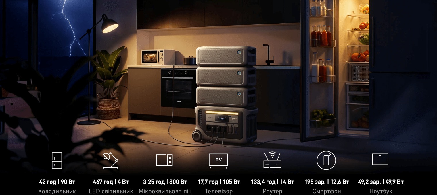 Пікова вихідна потужність становить 3600 Вт, що дозволяє одночасно живити холодильник, освітлення, Wi-Fi, медичне обладнання та інші побутові прилади. Завдяки режиму наскрізного заряджання станція може одночасно заряджатися та віддавати потужність без перерви в живленні пристроїв. Місткість можна розширити до 12 288 Вт·год, під'єднавши до трьох додаткових батарей.