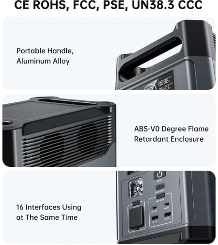 Ви зможете використовувати цю електростанцію як аварійне чи резервне джерело живлення для свого телефону, невеликого вентилятора, ноутбука, радіо тощо. Вона оснащена двома розетками змінного струму потужністю до 2400 Вт, автомобільною розеткою 12В / 10А, двома портами USB-A з потужністю до 18 Вт кожен, двома USB-C з максимальною потужністю 30 Вт і 100 Вт відповідно. Підтримує протоколи швидкого заряджання Power Delivery та Quick Charge 3.0. Підтримка Wi-Fi та Bluetooth дозволяє керувати станцією через мобільний додаток: вмикати/вимикати порти, контролювати заряд, встановлювати таймери, отримувати сповіщення про рівень енергії та стан системи — все прямо зі смартфона.