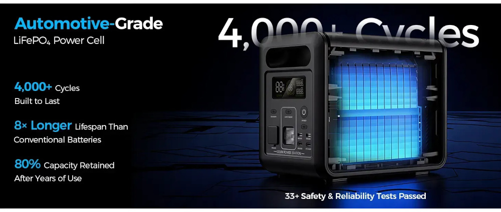 Зарядна станція Choetech BS068 — це сучасне портативне джерело живлення, розраховане як на щоденне домашнє використання, так і на умови активного відпочинку чи аварійного знеструмлення. В основі пристрою лежить акумулятор LiFePO4 місткістю 1024 Вт-год — один із найнадійніших і найбезпечніших типів батарей сьогодні. Завдяки стабільній хімії осередків та вбудованій системі управління (BMS) станція витримує понад 4000 циклів заряджання, зберігаючи щонайменше 80% початкової місткості.