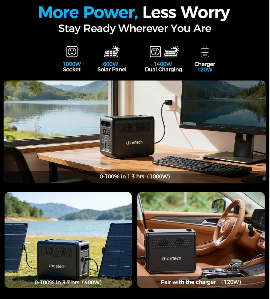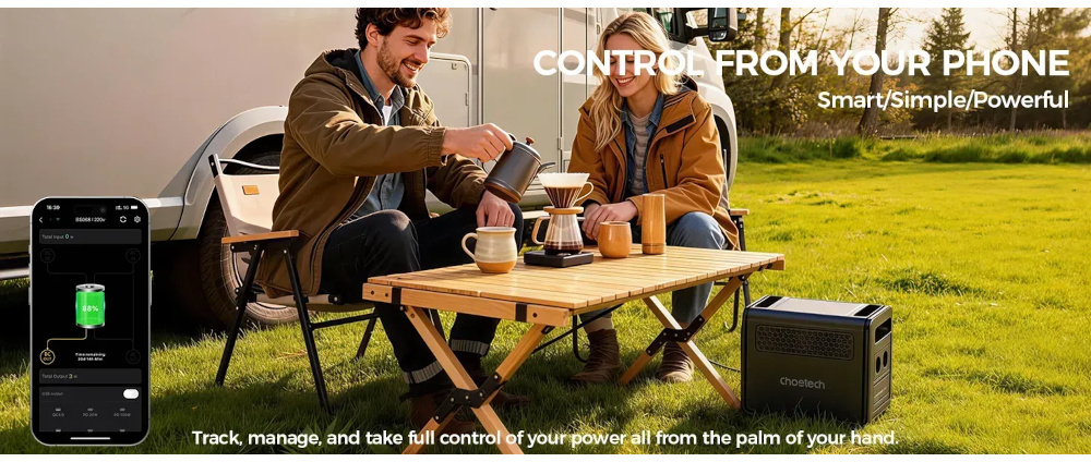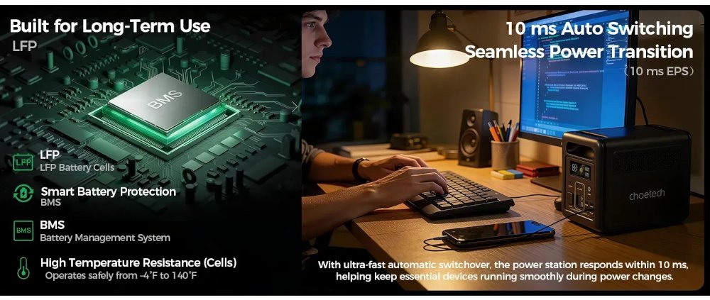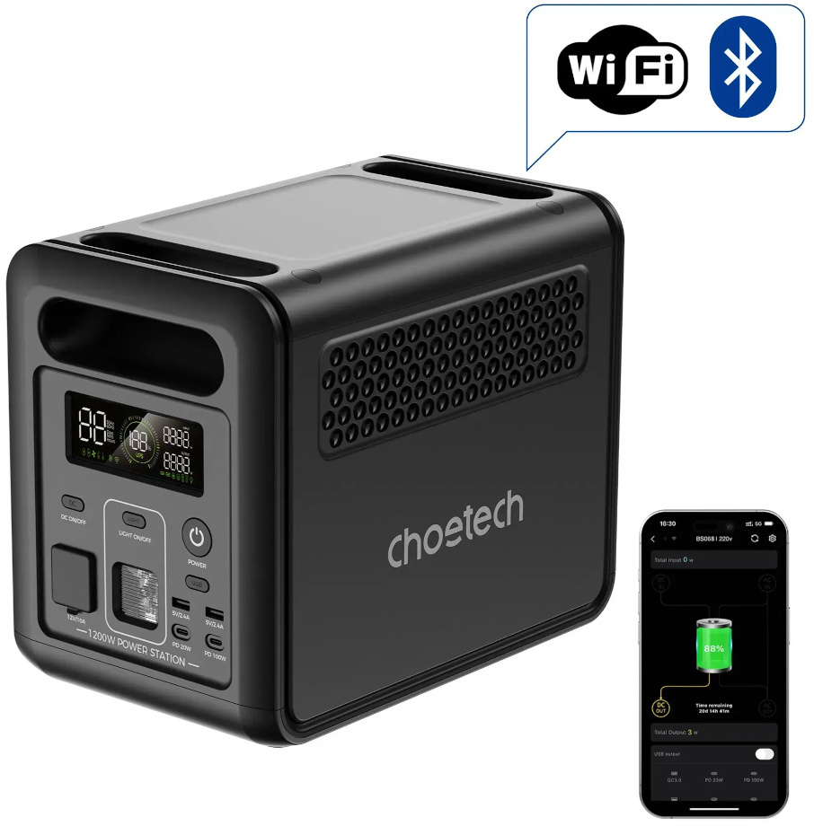 Choetech BS068 1200W 1024Wh — це продуманий продукт для тих, хто шукає надійну та довговічну портативну електростанцію. Поєднання потужного акумулятора LiFePO4 з ресурсом понад 4000 циклів, функцій ДБЖ, бездротового керування через WiFi/Bluetooth та гнучких способів зарядки робить цей пристрій актуальним як для умов постійних відключень електрики, так і для тих, хто цінує технологічну самодостатність у будь-якій точці світу.