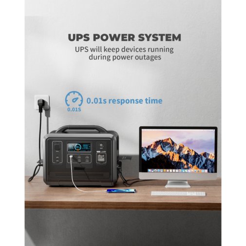 Щоб скористатися функцією ДБЖ, під'єднайте електростанцію до настінної розетки за допомогою зарядного кабелю змінного струму, потім натисніть кнопку розетки змінного струму та підключіть свої пристрої через вихідні порти змінного струму. У разі раптового відключення світла виріб може автоматично перейти в режим живлення від акумулятора.