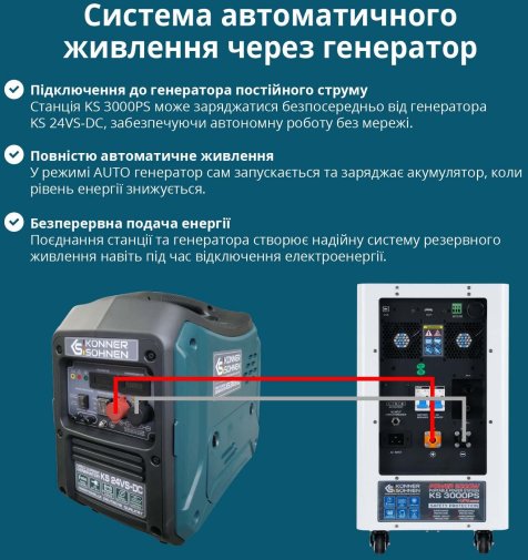 Станція дає змогу заряджатися від чотирьох джерел — мережі, сонячних панелей, зовнішньої батареї або генератора постійного струму. Завдяки DC-виходу 24V вона підтримує інтеграцію з генераторами KS 24V-DC через систему Tandem Power, яка автоматично оптимізує роботу та зменшує витрати палива.