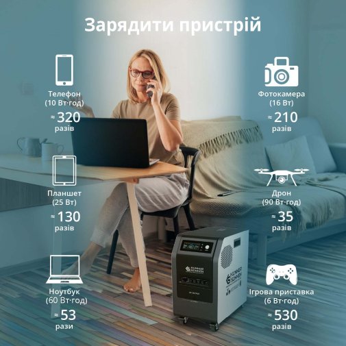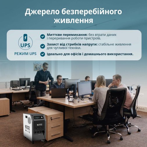 Електростанція забезпечує безперебійне живлення підключених пристроїв навіть під час відключень електроенергії або коливань напруги в мережі. Станція перемикає на себе живлення протягом мілісекунд, захищаючи від втрати даних, пошкодження пристроїв та перерв у роботі.