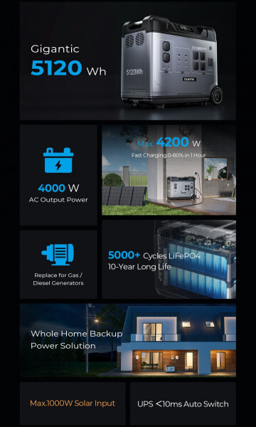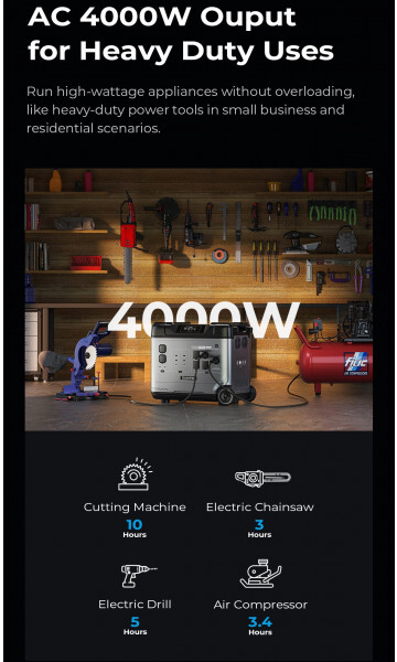 Вона виглядає надійно й професійно, ніби готова до будь-яких викликів. Місткість 5120 Вт·год на базі LiFePO4 (понад 4000 циклів до 80 % місткості) — це реально кілька діб автономії для всього будинку: холодильник + морозилка + освітлення + телевізор + роутер + насос чи навіть кондиціонер працюють безперервно. Номінальна потужність 4000 Вт (пік 8000 Вт) з чистою синусоїдою дозволяє живити практично будь-яку побутову техніку — від мікрохвильовки до електроінструментів чи зварювального апарату.