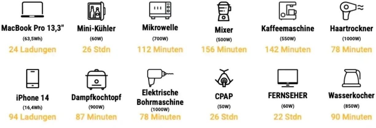Станція ідеально підходить для тривалих блекаутів: вона може живити портативний холодильник потужністю 60 Вт до 26 годин, мікрохвильовку понад 1,5 години, а ноутбук заряджати до 24 разів або сучасний смартфон iPhone до 94 разів без підзарядки самої станції. Завдяки можливості одночасного живлення до 11 пристроїв через різні порти, щоб ви завжди залишались на зв'язку та з необхідною технікою в робочому стані.