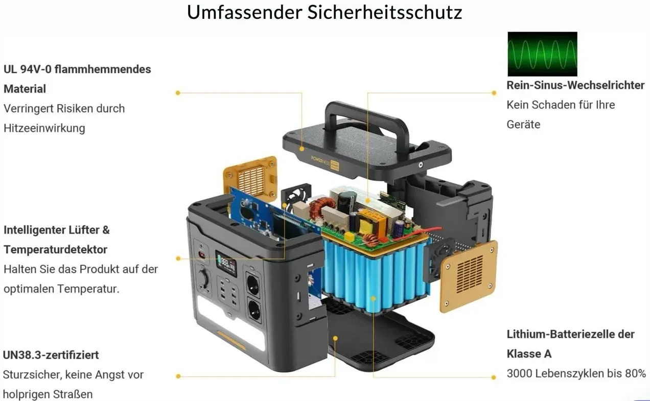 Використання літій-залізо-фосфатної батареї (LiFePO4) гарантує довговічність: понад 3000 циклів повного заряду-розряду. Вбудована система управління батареєю BMS постійно моніторить температуру, напругу та струм, захищаючи від перевантаження, короткого замикання, перегріву та інших ризиків. Станція працює в широкому діапазоні температур — від -20 до +45 °C при розрядці, що робить її універсальною для використання взимку чи влітку.