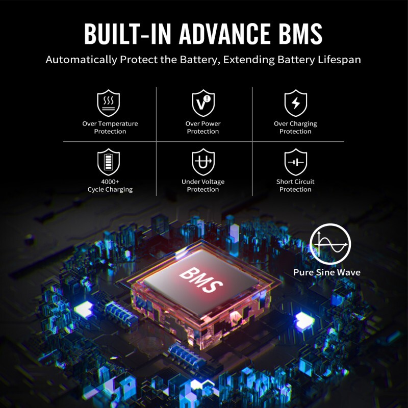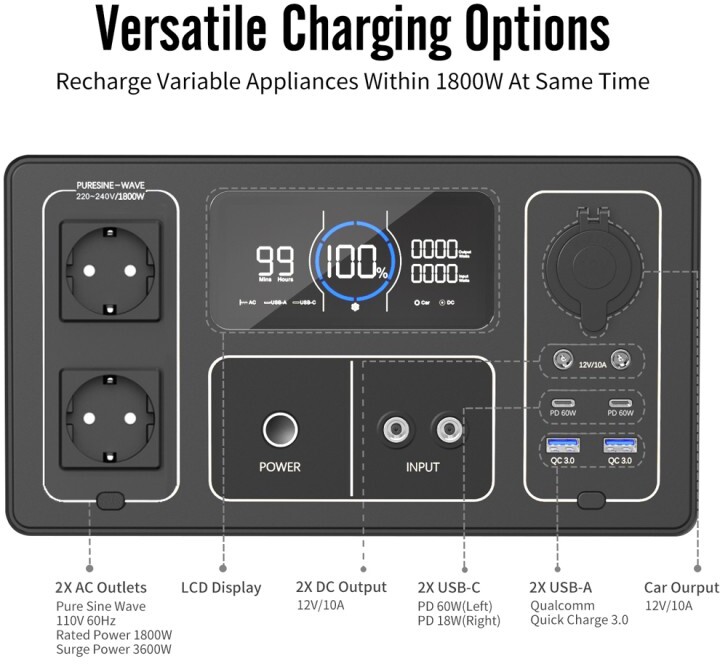 Станція оснащена чистою синусоїдальною інверторною технологією, що дозволяє безпечно підключати чутливу техніку без ризику пошкоджень. Вона видає 1 800 Вт безперервно через дві розетки 230 В, а також пропонує великий набір портів: три 12 В (загалом до 120 Вт, включаючи прикурювач), два USB-C PD (до 60 Вт і 18 Вт), два USB-A (до 18 Вт). Це дає змогу одночасно живити та заряджати багато пристроїв — від телефонів і дронів до освітлення чи невеликої побутової техніки.