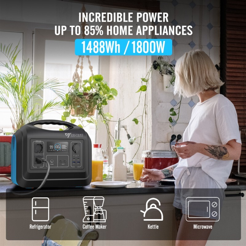 Voltero PS18 — це потужна портативна зарядна станція місткістю 1 488 Вт-год із номінальною потужністю 1 800 Вт (пікова до 4 000 Вт), створена для надійного автономного живлення в будь-яких умовах. Вона використовує довговічну батарею LiFePO4, яка витримує понад 3 500 повних циклів заряду, забезпечуючи стабільну роботу протягом багатьох років без суттєвої втрати місткості. Це ідеальне рішення для кемпінгу, подорожей на природі, створення мобільного офісу чи резервного живлення вдома під час відключень електроенергії.