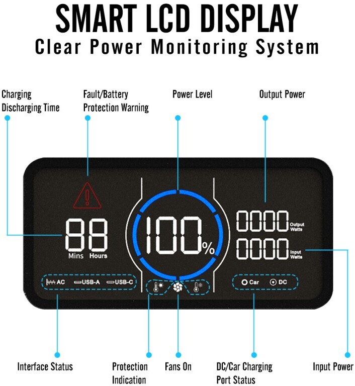 Заряджати PS18 можна кількома способами: від мережі, від автомобільного прикурювача або від сонячних панелей. Підтримка одночасного заряду та використання робить її зручною для тривалого автономного режиму. Великий кольоровий LED-дисплей показує в реальному часі рівень заряду, вхідну/вихідну потужність та точний час роботи до хвилини, допомагаючи ефективно планувати енергоспоживання.