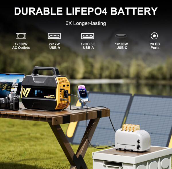 Vtoman FlashSpeed 300 оснащена універсальними портами: один AC-вихід 110 В на 300 Вт для побутової техніки, один PD 100 Вт Type-C для швидкої зарядки ноутбуків і смартфонів, три USB-A, а також кілька DC-виходів і автомобільний порт. Вона легко живить ноутбуки чи смартфон, вентилятори чи лампи, що робить її незамінною для повсякденного використання та екстрених ситуацій. Додатково вбудоване LED-підсвічування з трьома режимами (освітлення, стробоскоп, SOS) додає зручності в польових умовах.