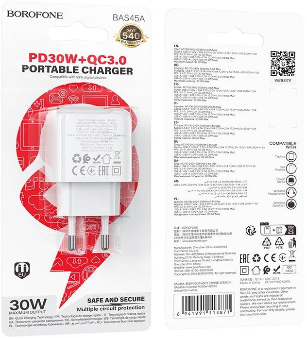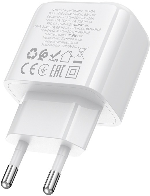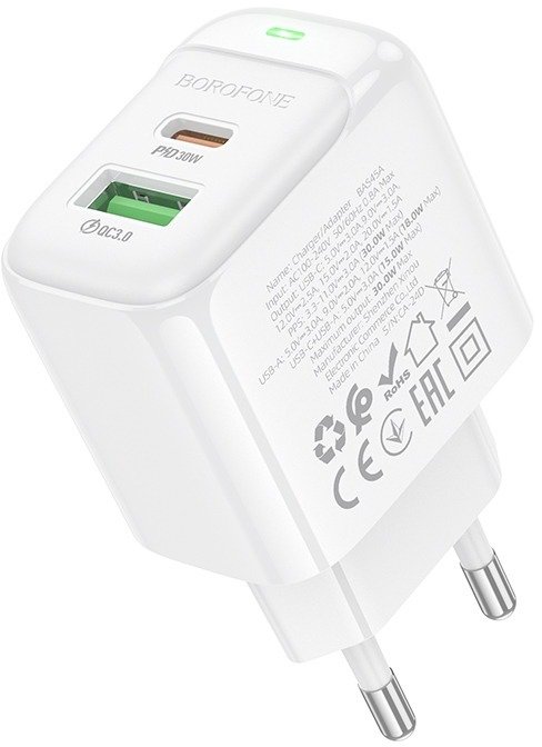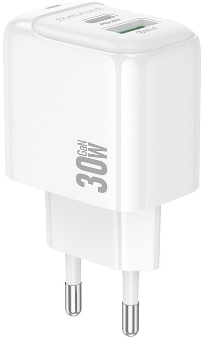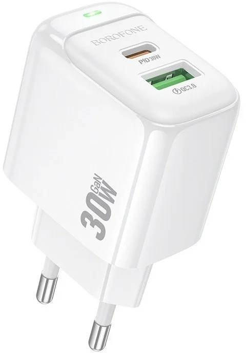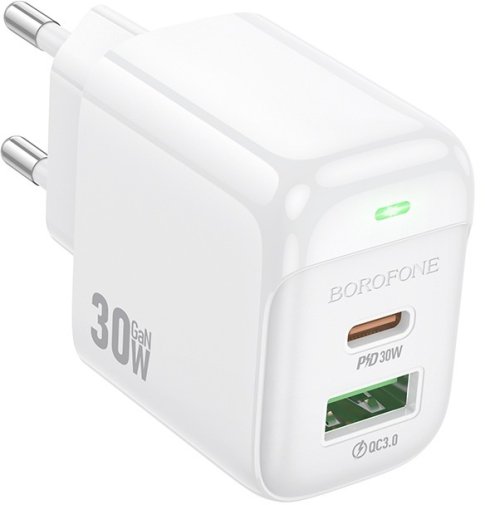 Мережевий зарядний пристрій BOROFONE BAS45A Potential оснащений двома портами: USB-A та Type-C. Це дозволяє одночасно заряджати кілька пристроїв або вибирати найбільш зручний роз'єм для вашого гаджета.