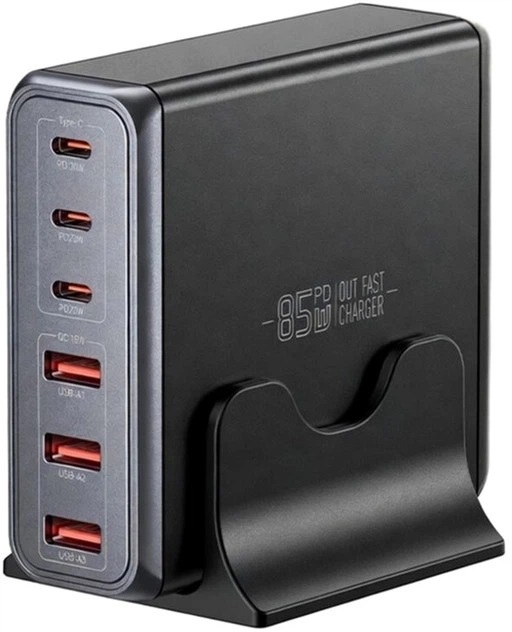 Головна перевага моделі — 6 портів (3 × USB-C + 3 × USB-A) і загальна потужність до 85 Вт. Це означає, що ви можете одночасно заряджати потужний ноутбук (наприклад, через USB-C з потужністю 65–85 Вт), смартфон на швидкій зарядці та ще кілька пристроїв — і потужність буде автоматично розподілятися оптимально, без суттєвої втрати швидкості. Підтримуються практично всі популярні протоколи швидкої зарядки: PD 3.0, QC 4.0 / QC 3.0, PPS, SCP, FCP, AFC та інші. Тому зарядка сумісна з технікою Apple, Samsung, Xiaomi, Huawei, Lenovo, Dell і багатьох інших брендів.