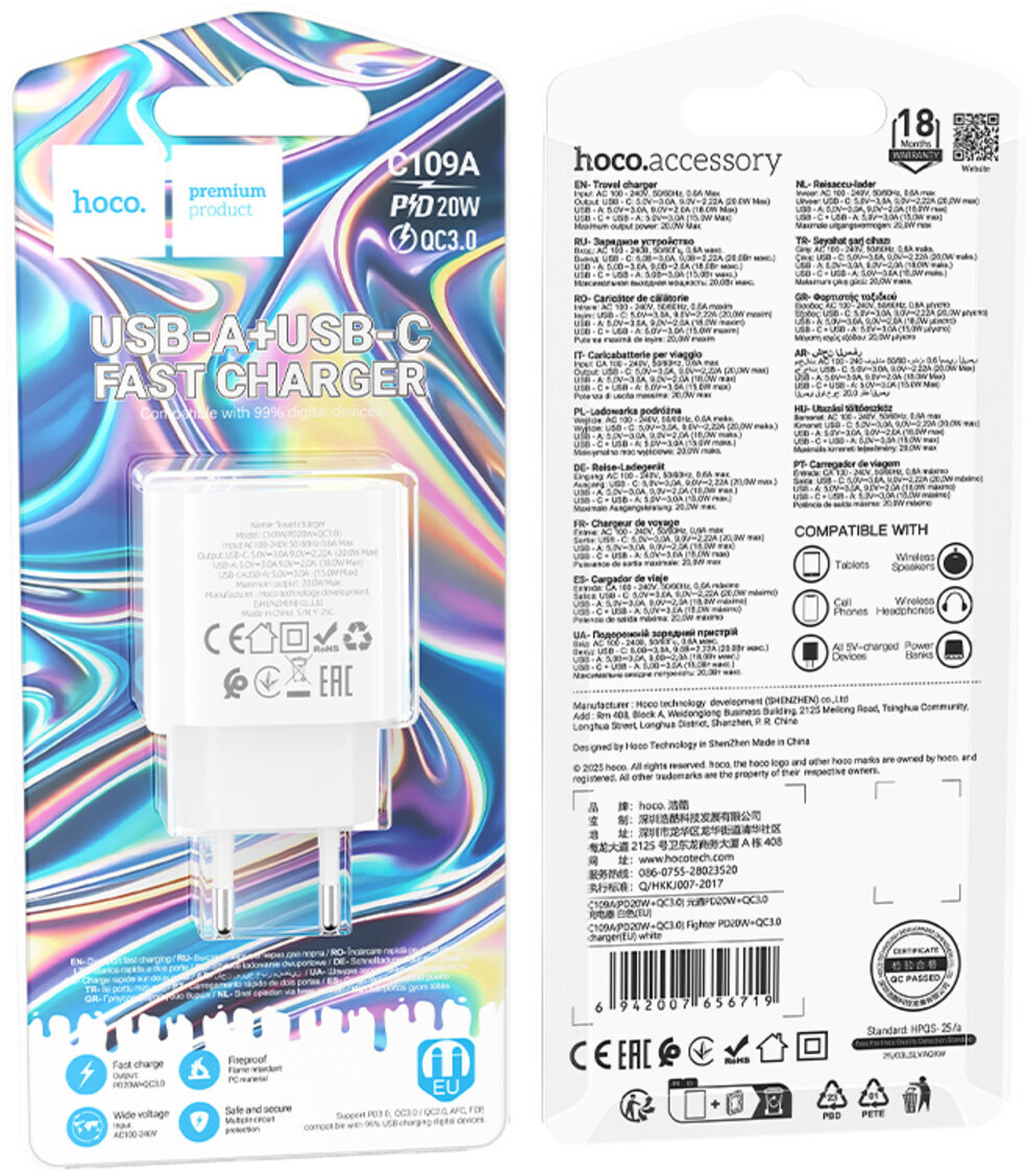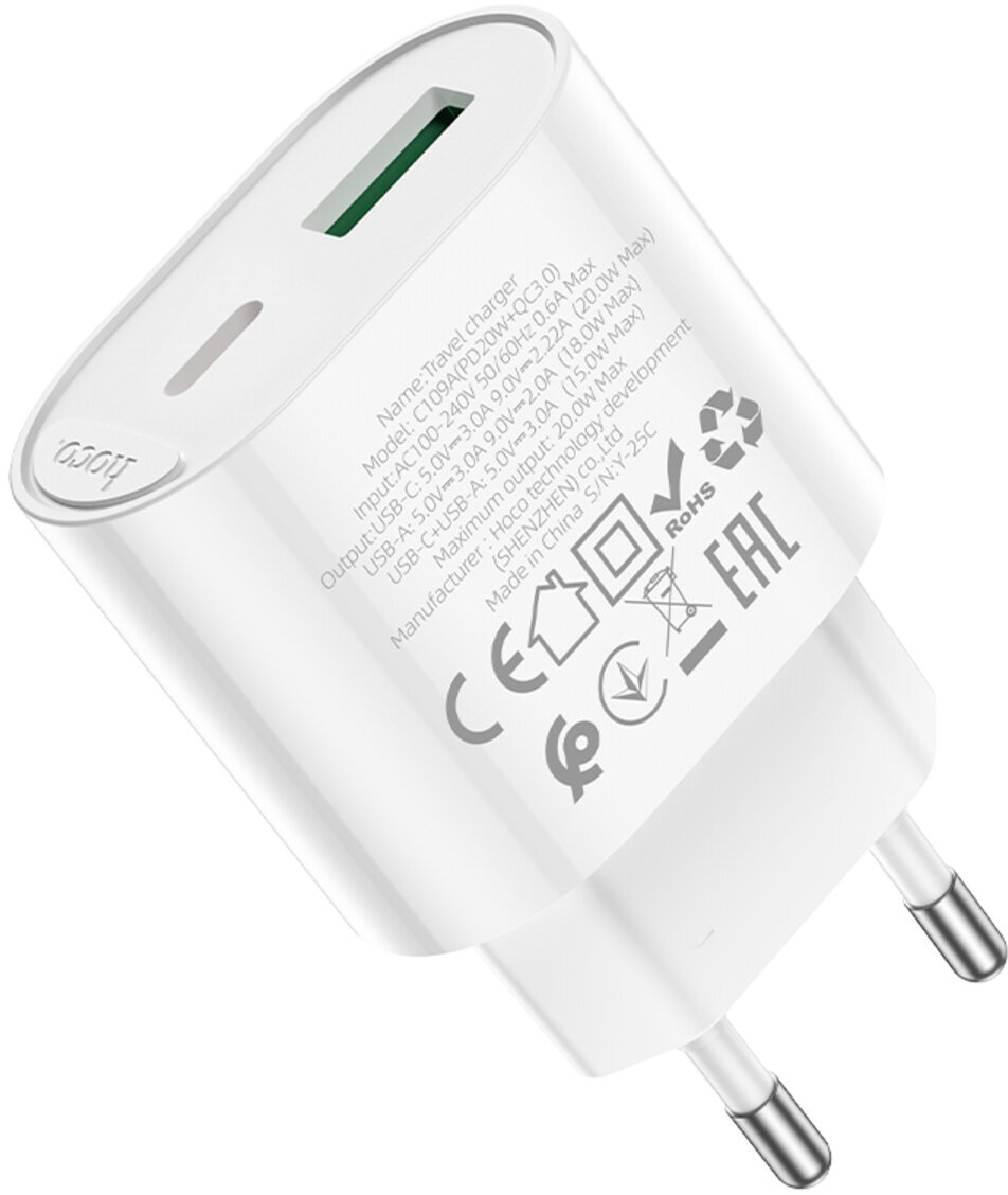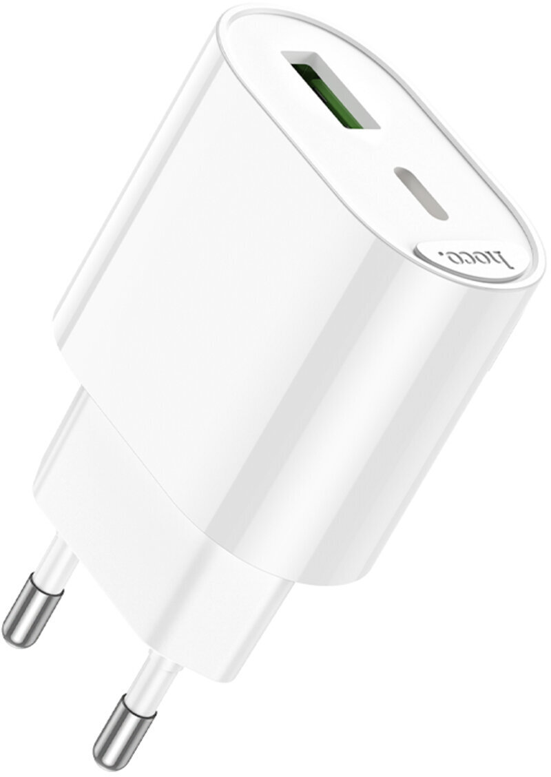 Зарядний пристрій Hoco C109A Fighter — це компактний мережевий блок з двома портами (USB-A та Type-C), який підтримує швидку зарядку PD 20 Вт через Type-C і QC 3.0 до 18 Вт через USB-A. Загальна потужність дозволяє заряджати два пристрої одночасно без втрати ефективності, що ідеально для смартфонів, планшетів, навушників чи інших гаджетів.