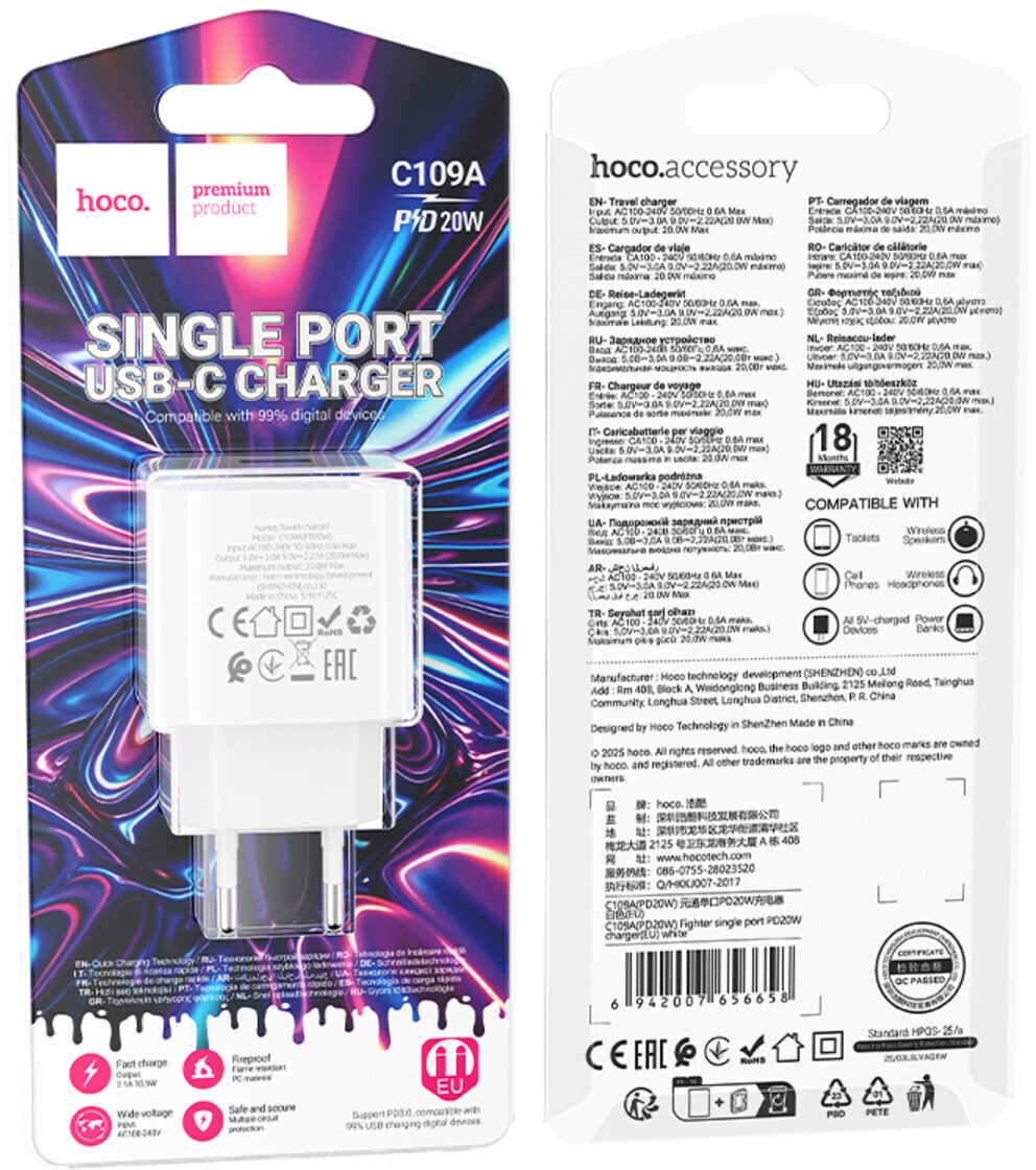 Мережевий зарядний пристрій Hoco C109A Fighter QC PD 20W — це компактний та надійний адаптер, створений для ефективного та безпечного заряджання сучасних гаджетів. Він підтримує технологію швидкого заряджання Power Delivery (PD) 20W, що дозволяє відновлювати заряд смартфонів, планшетів та інших пристроїв максимально швидко.