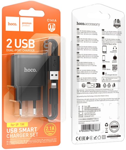 Hoco C141A with AM/Lightning — це надійний і зручний мережевий зарядний пристрій, який дозволяє одночасно заряджати два гаджети без компромісів зі швидкістю та безпекою. Завдяки двом USB-портам із загальною силою струму 2.1 А ви можете під'єднати смартфон і планшет, телефон і бездротові навушники або будь-які інші пристрої.