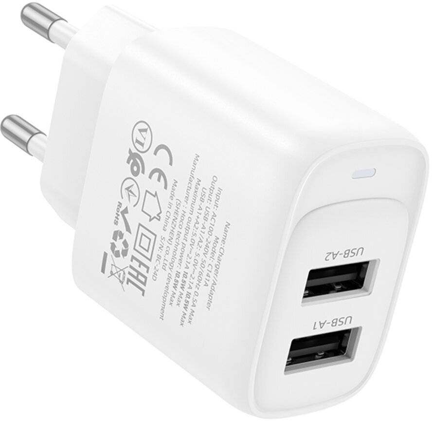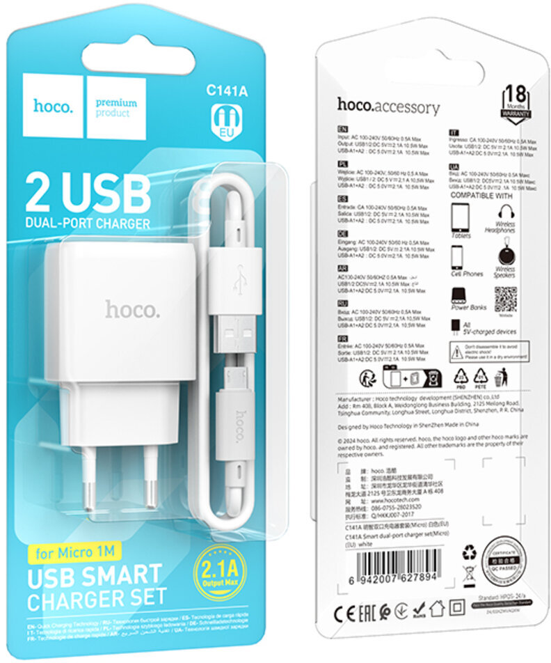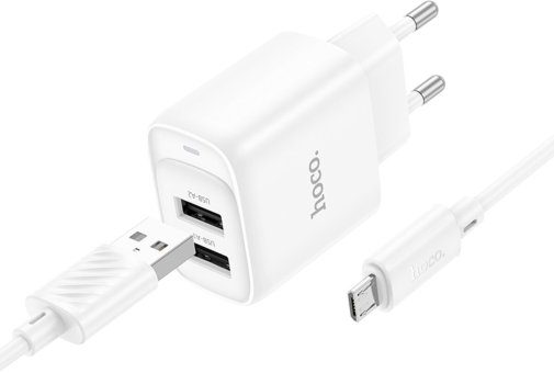 Hoco C141A with AM/MicroUSB — це надійний і зручний мережевий зарядний пристрій, який дозволяє одночасно заряджати два гаджети без компромісів зі швидкістю та безпекою. Завдяки двом USB-портам із загальною силою струму 2.1 А ви можете під'єднати смартфон і планшет, телефон і бездротові навушники або будь-які інші пристрої.