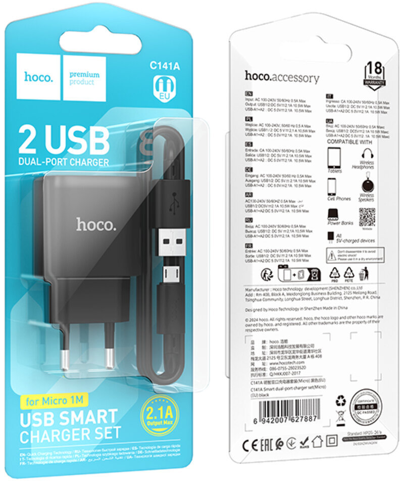 Зарядний пристрій Hoco C141A — це практичний мережевий блок з двома USB-портами, який дозволяє одночасно заряджати два гаджети. Загальна потужність 10 Вт забезпечує стабільний і досить швидкий заряд для смартфонів, планшетів, TWS-навушників та інших пристроїв.