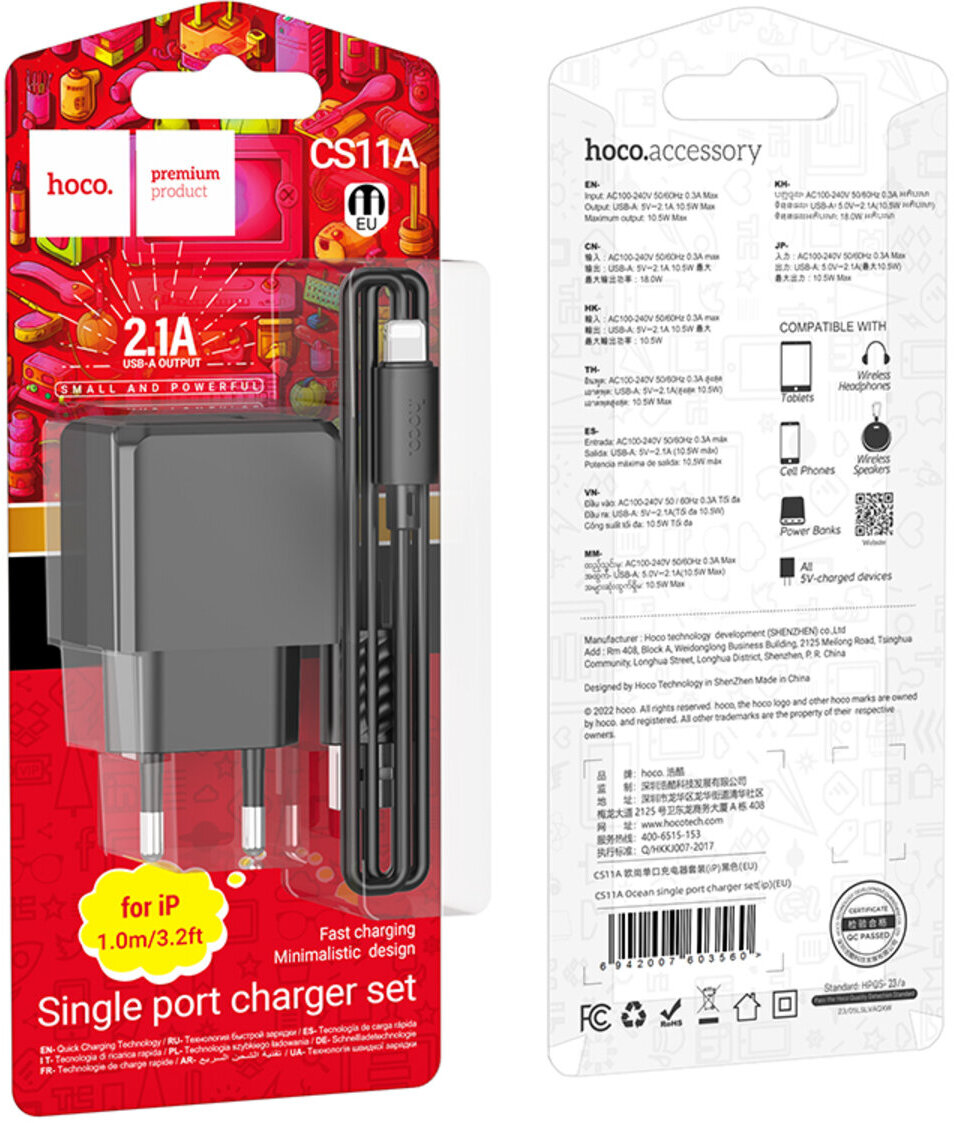 Hoco CS11A Ocean — мережевий зарядний пристрій, призначений для зарядки ґаджетів від мережі змінного струму. Постачається з кабелем. Оснащений вилкою європейського стандарту та одним роз'ємом USB Type-A. Підтримує зарядку з максимальною потужністю 10.5 Вт.