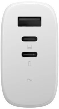 Зарядка оснащена трьома портами: двома USB Type-C з підтримкою Power Delivery та одним USB Type-A, що дозволяє одночасно заряджати до трьох гаджетів — наприклад, ноутбук, планшет і смартфон. Інтелектуальний розподіл потужності автоматично адаптується до підключених пристроїв, забезпечуючи максимальну швидкість: при підключенні одного девайсу він отримує повні 67 Вт, а при роботі з кількома — енергія ефективно розподіляється між ними. Завдяки цьому iPhone може зарядитися до 50% менш ніж за 30 хвилин, а старіші пристрої з USB-A також отримують стабільне живлення.