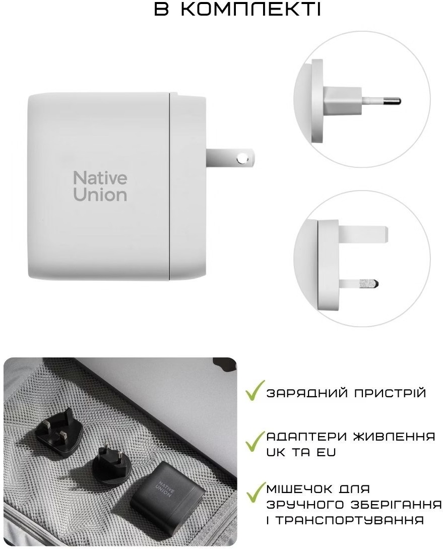 Окрім швидкості та універсальності, зарядний пристрій вирізняється безпекою й енергоефективністю. Технологія GaN значно зменшує нагрівання порівняно зі звичайними зарядками, а вбудований захист від перенапруги, перевантаження та перегріву дбає про довговічність батарей. Стильний корпус із металу та полікарбонату виглядає елегантно, а в комплекті йдуть міжнародні адаптери для різних розеток та зручна маленька сумка — усе це робить Native Union Fast GaN Charger справжнім помічником у повсякденному житті та подорожах.