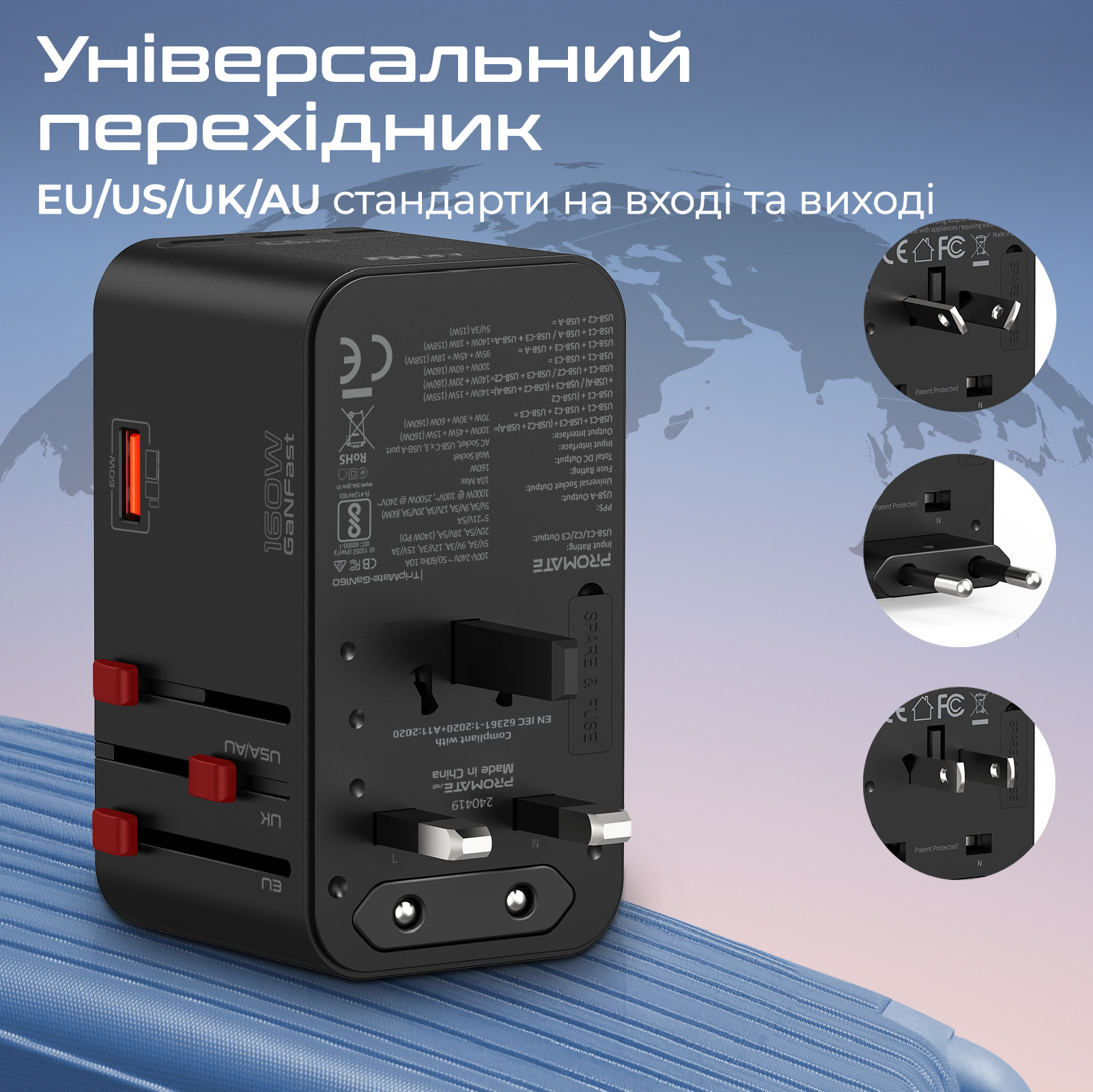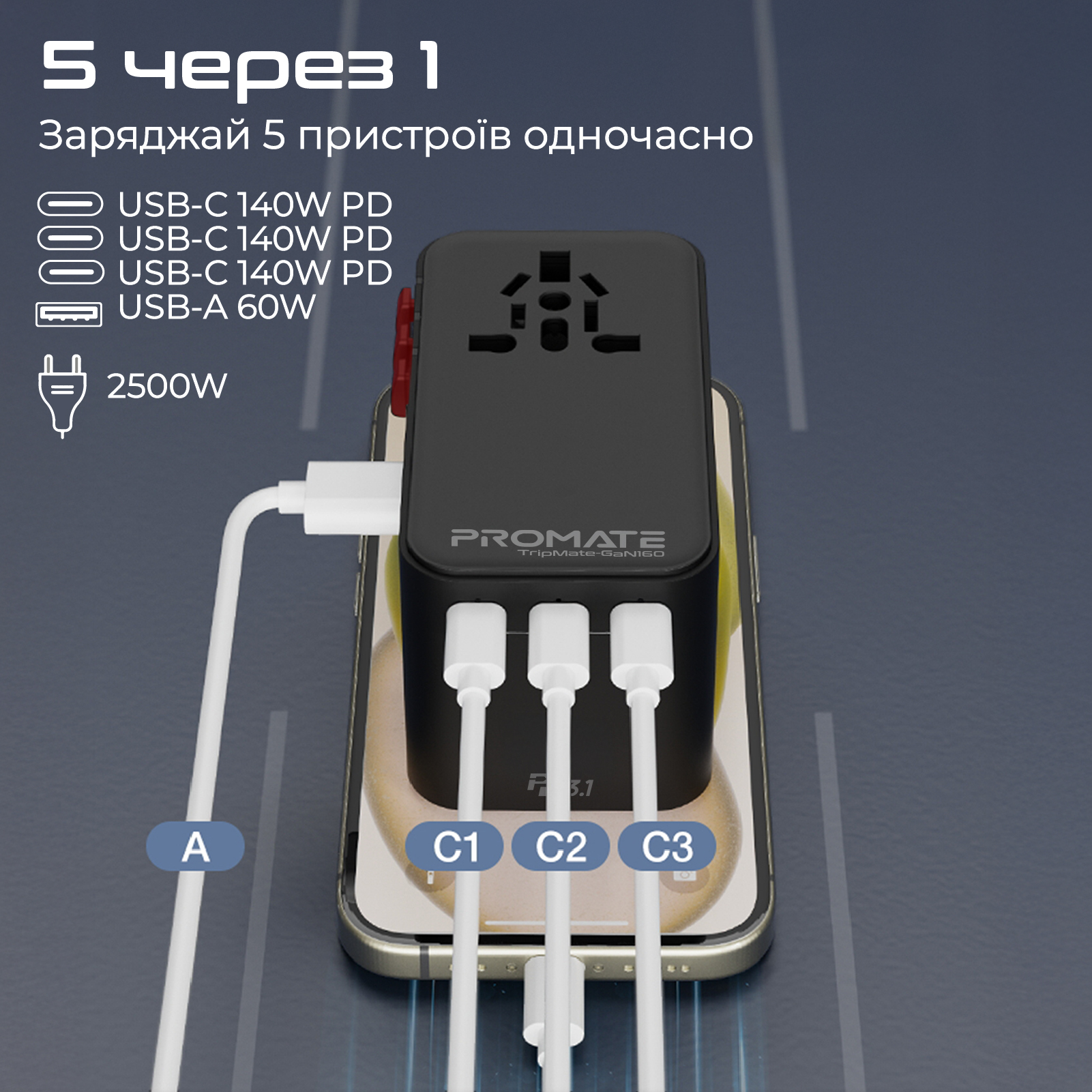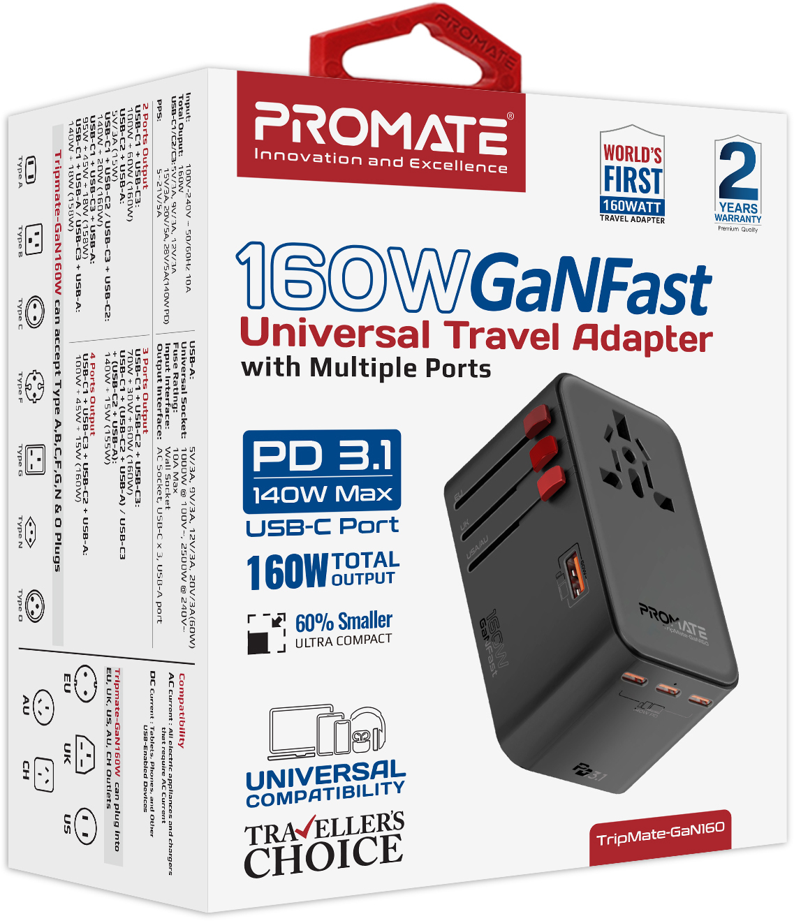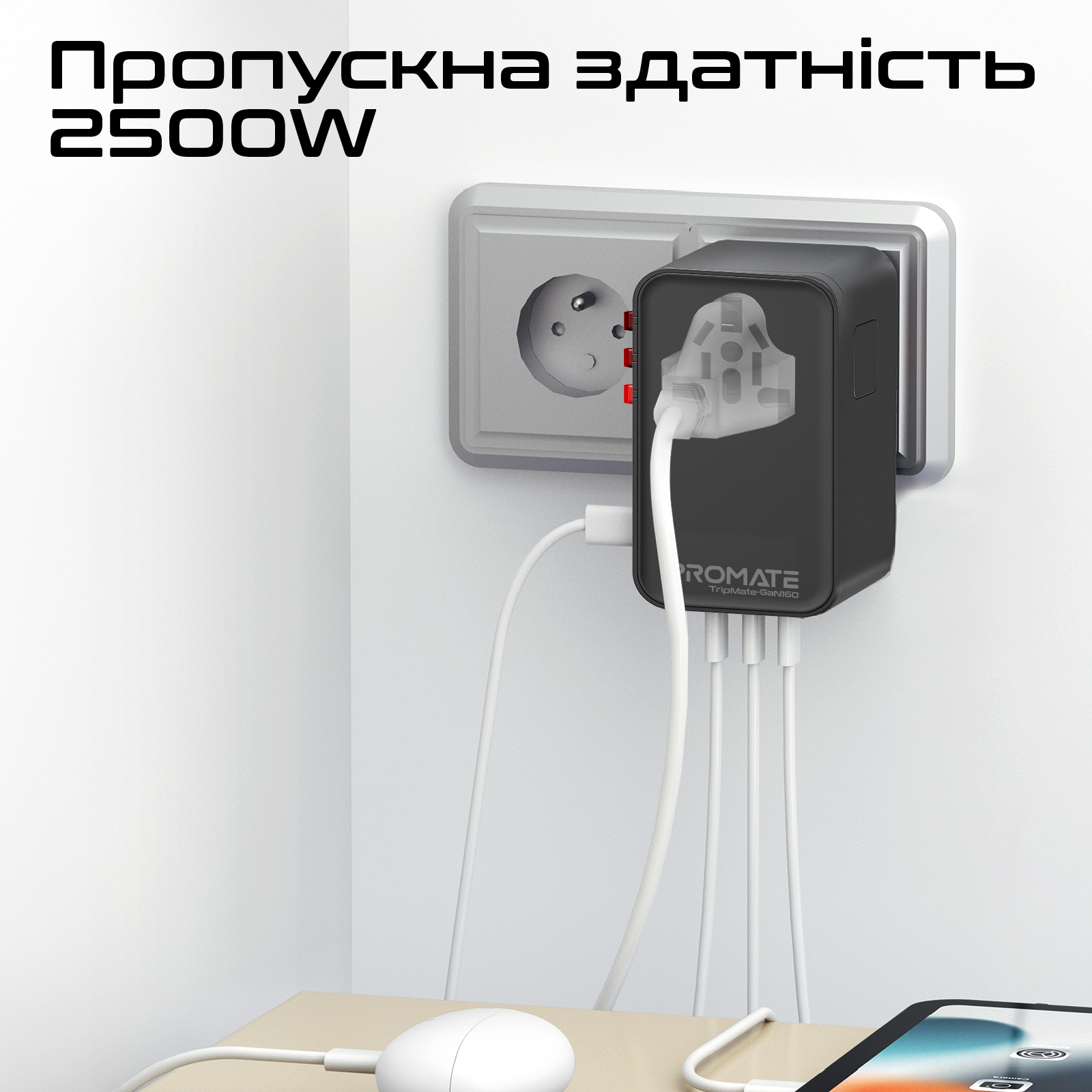 TripMate-GaN160 - нова модель з лінійки мережевих перехідників TripMate-GaN від Promate. Більше потужності для швидкої зарядки твоїх девайсів.