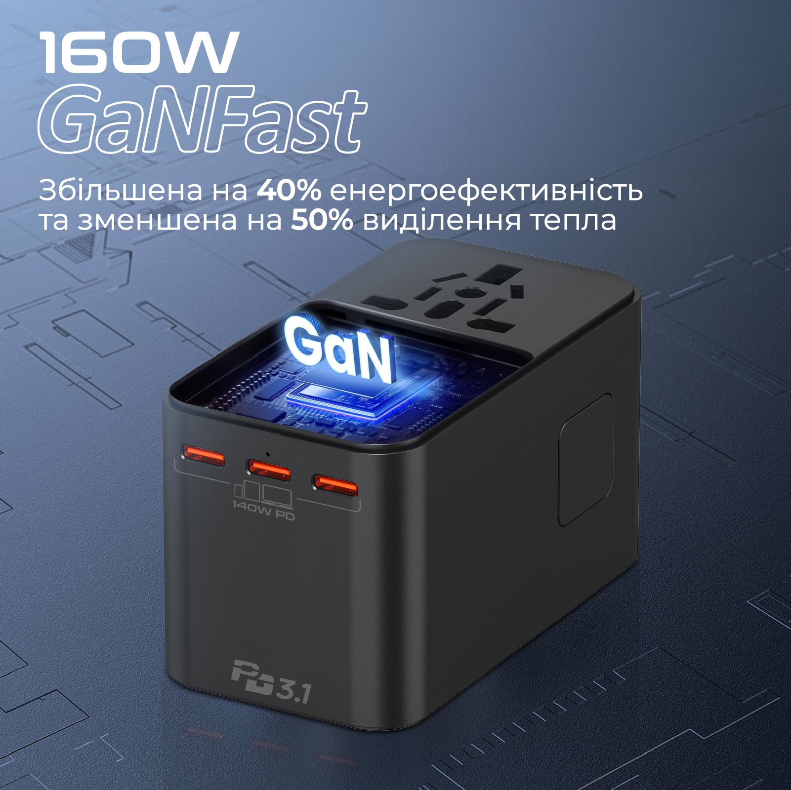 - Безпека: Чіп Smart IC захистить TripMate-GaN160 та підключені до нього пристрої від перегріву та надмірної зарядки.