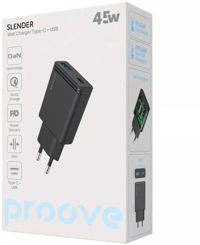 Завдяки універсальному входу AC 100–240V пристрій однаково ефективно працює в різних електромережах, а максимальна вихідна потужність 45W гарантує швидке відновлення заряду навіть енергоємних пристроїв. У результаті Proove Slender 45W поєднує компактність, універсальність і високу швидкість зарядки, залишаючись надійним щоденним аксесуаром для сучасних гаджетів.