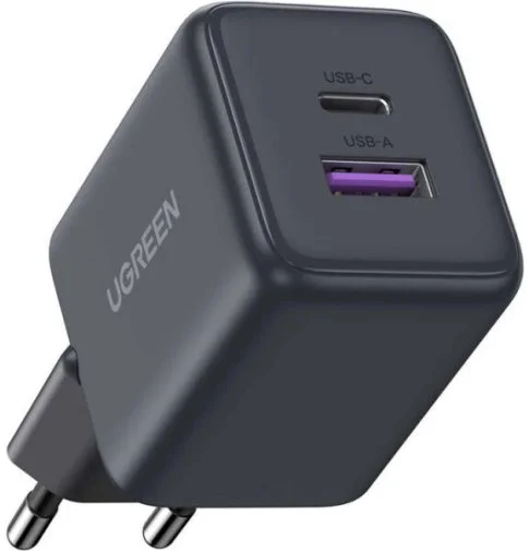 Мережевий зарядний пристрій Ugreen є компактним і універсальним рішенням для одночасного заряджання двох пристроїв. Він оснащений двома портами: одним USB Type-A і одним USB Type-C, що дозволяє використовувати як сучасні кабелі з Type-C, так і класичні з Type-A. Загальна максимальна потужність становить 30 Вт, чого достатньо для швидкого заряджання більшості смартфонів, планшетів і навіть деяких ноутбуків.