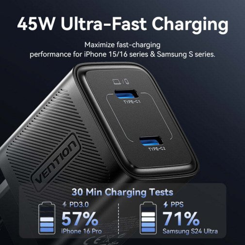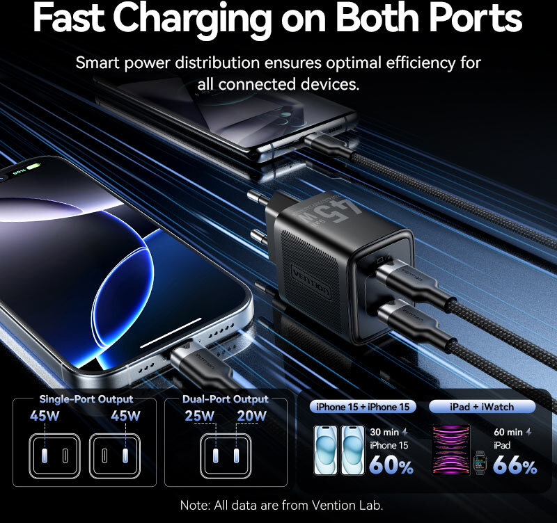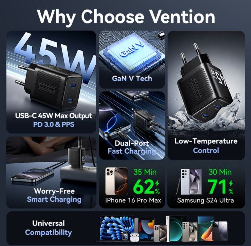 Vention 45W GaN - це стратегічне рішення для професіоналів і мандрівників, де GaN-технологія поєднується з інтелектуальним розподілом потужності та компактністю, перетворюючи рутину зарядки на безтурботний процес, забезпечуючи стабільну продуктивність ґаджетів у динамічному цифровому середовищі.