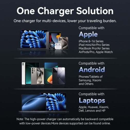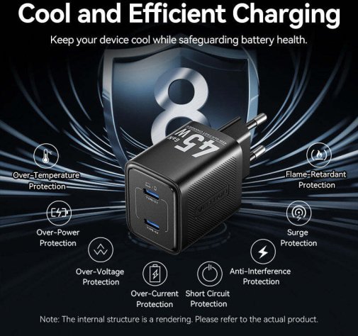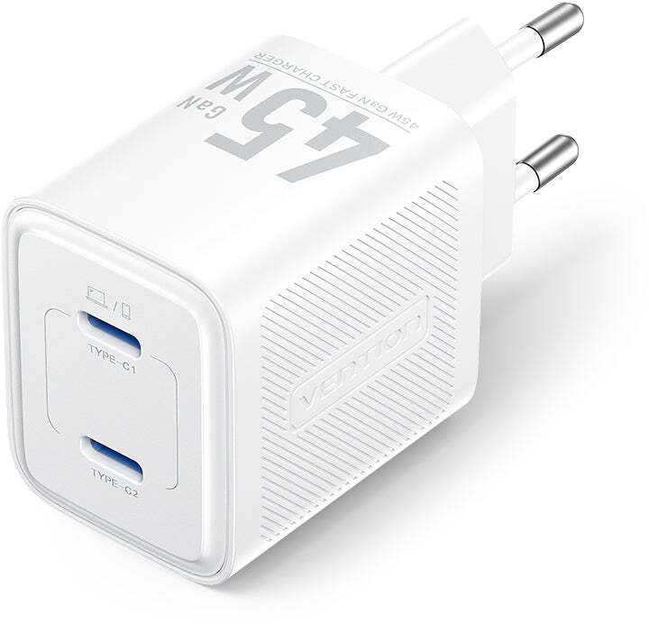 Ця модель в елегантному білому кольорі базується на передовій технології GaN, що дозволяє досягти максимальної потужності 45 Вт у надзвичайно компактному корпусі, зменшуючи розміри на 30% порівняно з традиційними зарядними пристроями аналогічної потужності, з двома USB-C портами для одночасного заряджання двох пристроїв — наприклад, смартфона та планшета, — з автоматичним розподілом енергії (до 45 Вт на один порт або 25 Вт + 20 Вт при двоцільовому використанні), перетворюючи потенційний дефіцит розеток на повноцінний хаб для ґаджетів. Підтримка протоколів PD 3.0, QC 3.0 робить його сумісним з широким спектром пристроїв, включаючи iPhone 15/16, Samsung, MacBook Air, iPad Pro та інші USB-C ґаджети, забезпечуючи повне заряджання за лічені години без перегріву завдяки інтелектуальному чипсету, що оптимізує струм під потреби пристрою.