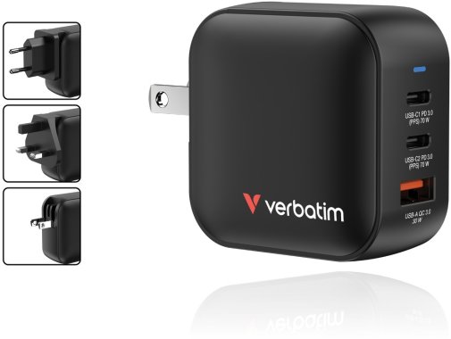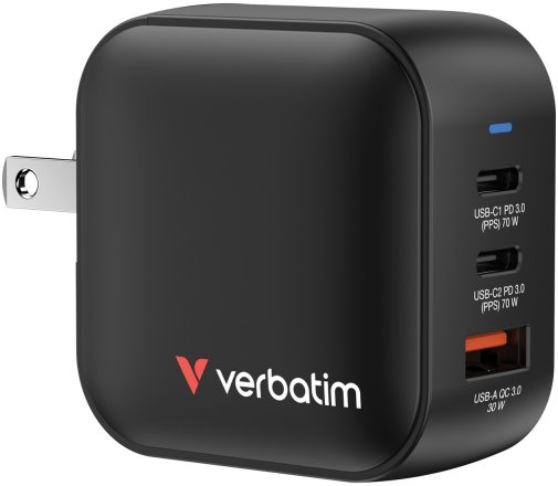 Зарядний пристрій Verbatim Mini GaN Wall Charger 70W 3-Port — це компактний і потужний аксесуар, який дозволяє одночасно заряджати до трьох пристроїв. Завдяки інноваційній технології GaN (нітрид галію) він забезпечує високу швидкість зарядки при значно меншому нагріванні порівняно з традиційними зарядками на кремнієвій основі. Два порти USB-C з підтримкою Power Delivery 3.0 видають до 70 Вт кожен, а порт USB-A з Quick Charge 3.0 — до 30 Вт, що робить пристрій ідеальним для смартфонів, планшетів, ігрових гаджетів та іншої техніки.